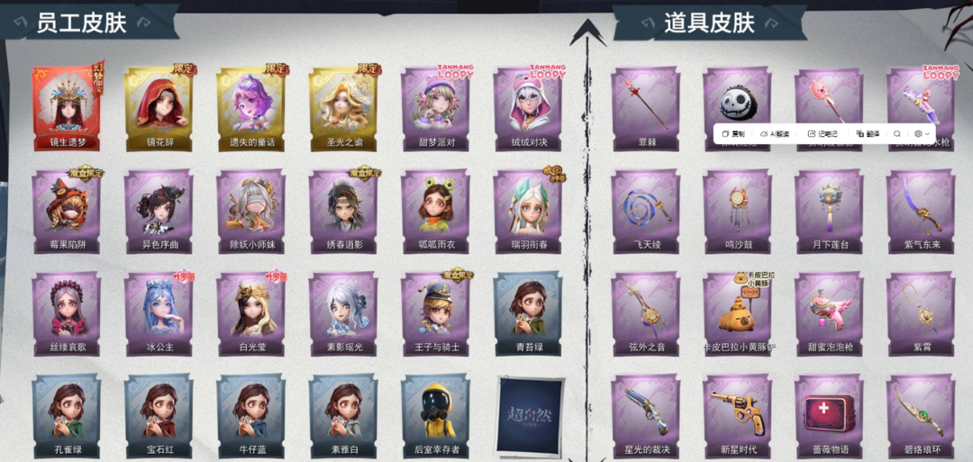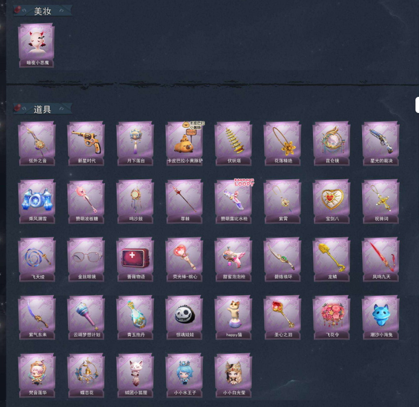 装备描述:【段位】超自然传说 【幻梦皮肤数量】1 【金色皮肤数量】3 【紫色皮肤数量】13 【道具皮肤数量】37 【累充】33040金砖 【赛季魔盒】普通魔盒 【员工】小黄、爱丽丝、零、阿念、逍遥、薇薇安、巫铃儿、莉莉、艾伦、爱德华、兰 【幻梦皮肤】巫铃儿-镜生遗梦 【金色皮肤】薇薇安-圣光之谕、小黄-遗失的童话、巫铃儿-镜花辞 【紫色皮肤】爱丽丝-甜梦派对、艾伦-绒绒对决、莉莉-莓果陷阱、小黄-异色序曲、莉莉-除妖小师妹、阿念-王子与骑士、爱丽丝-冰公主、薇薇安-白光莹、爱丽丝-瑞羽衔春、巫铃儿-素影瑶光、爱丽丝-丝缕哀歌、逍遥-绣春逍影、小黄-呱呱雨衣 【道具皮肤】除颤仪-弦外之音、转轮手枪-新星时代、腰包-月下莲台、铲子-卡皮巴拉小黄豚铲、葫芦-伏妖塔、摸金符-花落精绝、传送按钮-昆仑镜、短管猎枪-星光的裁决、喷气背包-乘风溯雪、铲子-赞萌波板糖、音响-鸣沙鼓、短管猎枪-赞萌露比水枪、摸金符-紫霄、腰包-宝剑八、摸金符-祝祷词、长鞭-飞天绫、夜视仪-金丝眼镜、急救包-蔷薇物语、电击枪-甜蜜泡泡枪、刺刀-碧络琅环、铲子-龙鳞、桃木剑-凤鸣九天、刺刀-紫气东来、专业手电-云端梦想计划、黄牛能量