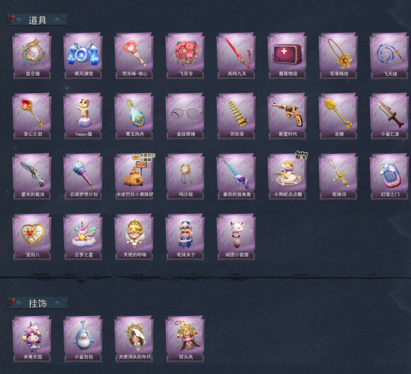 装备描述:【段位】大师 【幻梦皮肤数量】1 【金色皮肤数量】3 【紫色皮肤数量】17 【道具皮肤数量】29 【累充】33120金砖 【赛季魔盒】普通魔盒 【员工】小黄、爱丽丝、零、阿念、逍遥、薇薇安、巫铃儿、莉莉、艾伦、爱德华、兰、小满 【幻梦皮肤】巫铃儿-镜生遗梦 【金色皮肤】薇薇安-圣光之谕、小黄-遗失的童话、巫铃儿-镜花辞 【紫色皮肤】阿念-迷途僵宝、莉莉-除妖小师妹、阿念-王子与骑士、莉莉-情公主、艾伦-水王子、爱丽丝-冰公主、小黄-罗丽、薇薇安-白光莹、逍遥-泽引山海、阿念-灵昭鹿鸣、爱丽丝-瑞羽衔春、小黄-霓裳踏雪、零-青云逸歌、巫铃儿-素影瑶光、爱丽丝-丝缕哀歌、逍遥-绣春逍影、小黄-呱呱雨衣 【道具皮肤】传送按钮-昆仑镜、喷气背包-乘风溯雪、额外的背包-飞花令、桃木剑-凤鸣九天、急救包-蔷薇物语、摸金符-花落精绝、长鞭-飞天绫、铲子-圣心之泪、音响-happy猫、黄牛能量饮料-青玉抱丹、夜视仪-金丝眼镜、葫芦-伏妖塔、转轮手枪-新星时代、铲子-龙鳞、刺刀-小鲨匕首、短管猎枪-星光的裁决、专业手电-云端梦想计划、铲子-卡皮巴拉小黄豚铲、音响-鸣沙鼓、桃木剑-最后的独角兽、长鞭-小狗