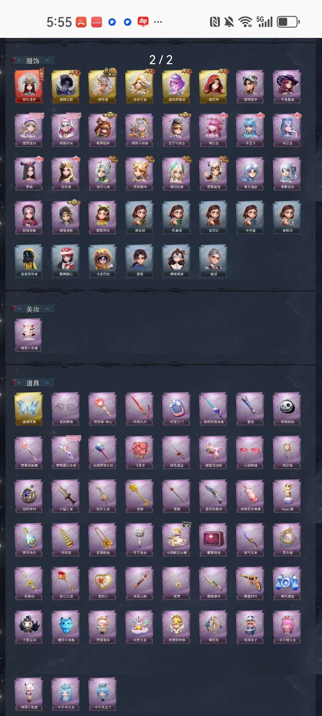 装备描述:【幻梦皮肤】巫铃儿-镜生遗梦 【金色皮肤】零-渡鸦公爵、逍遥-莲华渡、薇薇安-圣光之谕、小黄-遗失的童话、巫铃儿-镜花辞 【紫色皮肤】艾伦-黎明猎手、兰-千夜星谕、爱丽丝-甜梦派对、艾伦-绒绒对决、莉莉-莓果陷阱、莉莉-除妖小师妹、阿念-王子与骑士、莉莉-情公主、艾伦-水王子、爱丽丝-冰公主、小黄-罗丽、薇薇安-白光莹、逍遥-泽引山海、阿念-灵昭鹿鸣、爱丽丝-瑞羽衔春、小黄-霓裳踏雪、零-青云逸歌、巫铃儿-素影瑶光、爱丽丝-丝缕哀歌、逍遥-绣春逍影、小黄-呱呱雨衣 【道具皮肤】喷气背包-晶澜灵翼、夜视仪-金丝眼镜、桃木剑-凤鸣九天、传送按钮-幻宠之门、桃木剑-最后的独角兽、专业手电-星寂、腰包-惊魂娃娃、铲子-赞萌波板糖、短管猎枪-赞萌露比水枪、专业手电-云端梦想计划、额外的背包-飞花令、桃木剑-绯色遗证、电击枪-甜蜜泡泡枪、夜视仪-心跳眼镜 【美妆】暗夜小恶魔 【载具】惊奇万圣涂装