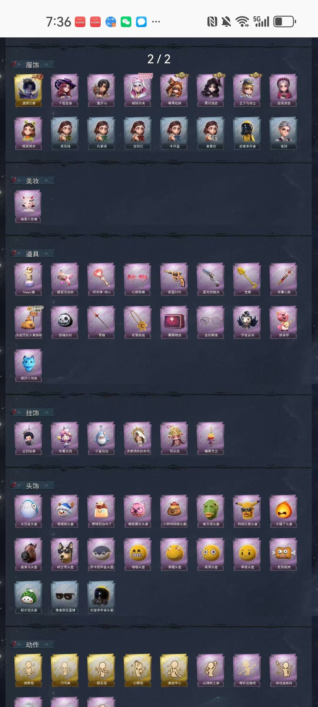装备描述:【金色皮肤】零-渡鸦公爵 【紫色皮肤】兰-千夜星谕、零-搬开山、艾伦-绒绒对决、莉莉-莓果陷阱、薇薇安-黑月挽歌、阿念-王子与骑士、爱丽丝-丝缕哀歌、小黄-呱呱雨衣 【道具皮肤】音响-happy猫、电击枪-甜蜜泡泡枪、夜视仪-心跳眼镜、转轮手枪-新星时代、短管猎枪-星光的裁决、铲子-龙鳞、急救包-末章心跳、铲子-卡皮巴拉小黄豚铲、腰包-惊魂娃娃、摸金符-花落精绝、急救包-蔷薇物语、夜视仪-金丝眼镜、背饰-子夜证词、背饰-班卓琴、背饰-潮汐小海兔 【美妆】暗夜小恶魔 【载具】惊奇万圣涂装 【动作】知世摇、刀马舞、鹏友摇、心跳摇、舞台中心、山楂树之舞、带你逃跑吧、律动迪斯科、举牌、抬手、旋转舞