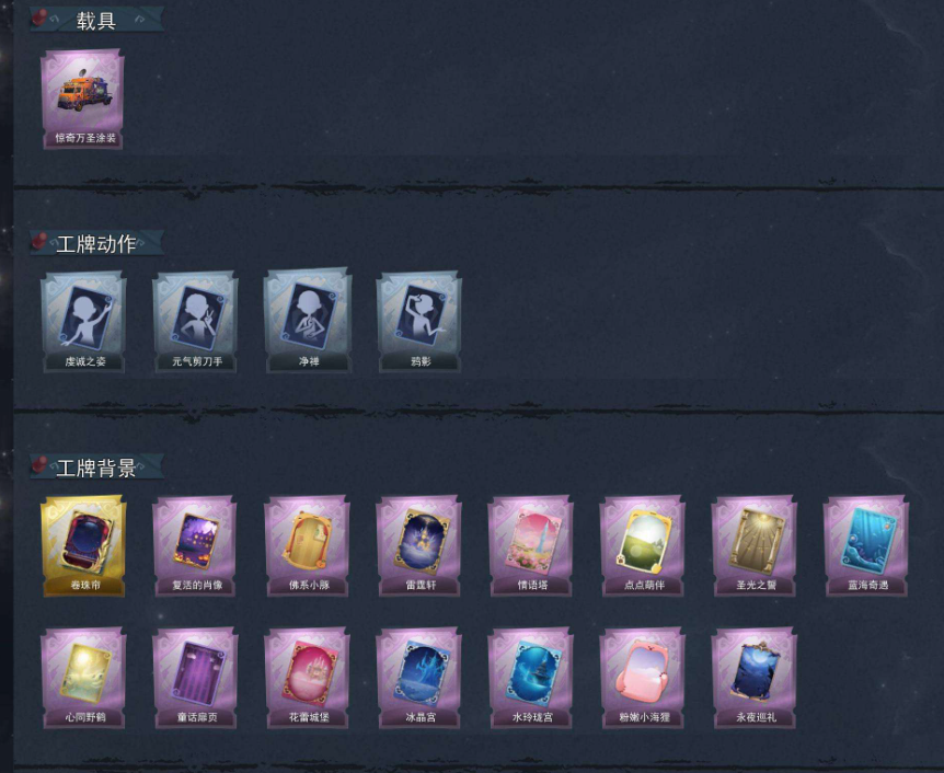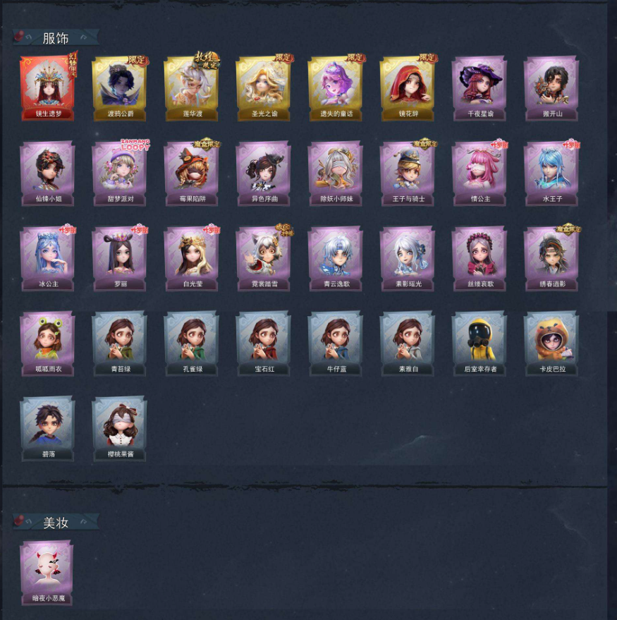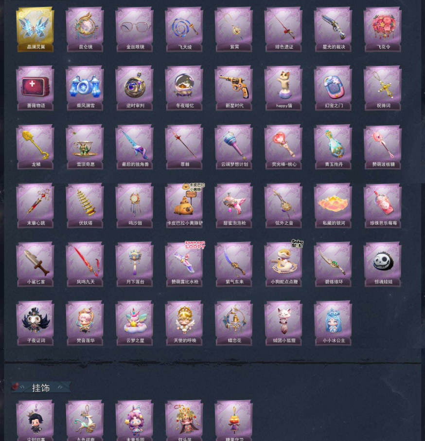 装备描述:【员工】小黄、爱丽丝、零、阿念、逍遥、薇薇安、巫铃儿、莉莉、艾伦、爱德华、兰、小满 【幻梦皮肤】巫铃儿-镜生遗梦 【金色皮肤】零-渡鸦公爵、逍遥-莲华渡、薇薇安-圣光之谕、小黄-遗失的童话、巫铃儿-镜花辞 【紫色皮肤】兰-千夜星谕、零-搬开山、薇薇安-仙锋小姐、爱丽丝-甜梦派对、莉莉-莓果陷阱、小黄-异色序曲、莉莉-除妖小师妹、阿念-王子与骑士、莉莉-情公主、艾伦-水王子、爱丽丝-冰公主、小黄-罗丽、薇薇安-白光莹、小黄-霓裳踏雪、零-青云逸歌、巫铃儿-素影瑶光、爱丽丝-丝缕哀歌、逍遥-绣春逍影、小黄-呱呱雨衣 【道具皮肤】喷气背包-晶澜灵翼、传送按钮-昆仑镜、夜视仪-金丝眼镜、长鞭-飞天绫、摸金符-紫霄、桃木剑-绯色遗证、短管猎枪-星光的裁决、额外的背包-飞花令、急救包-蔷薇物语、喷气背包-乘风溯雪、传送按钮-逆时审判、音响-冬夜暖忆、转轮手枪-新星时代、音响-happy猫、传送按钮-幻宠之门、摸金符-祝祷词、铲子-龙鳞、黄牛能量饮料-雪顶奇愿、桃木剑-最后的独角兽、专业手电-云端梦想计划、黄牛能量饮料-青玉抱丹、铲子-赞萌波板糖、急救包-末章心跳、葫芦-伏妖塔、音响-鸣沙鼓、铲子-