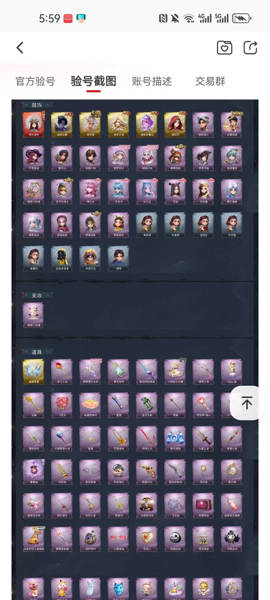 装备描述:【幻梦皮肤】巫铃儿-镜生遗梦 【金色皮肤】零-渡鸦公爵、逍遥-莲华渡、薇薇安-圣光之谕、小黄-遗失的童话、巫铃儿-镜花辞 【紫色皮肤】艾伦-黎明猎手、阿念-庆宴绮愿、兰-千夜星谕、零-搬开山、薇薇安-仙锋小姐、爱丽丝-甜梦派对、艾伦-绒绒对决、莉莉-莓果陷阱、小黄-异色序曲、阿念-迷途僵宝、莉莉-除妖小师妹、阿念-王子与骑士、莉莉-情公主、艾伦-水王子、爱丽丝-冰公主、小黄-罗丽、薇薇安-白光莹、零-青云逸歌、巫铃儿-素影瑶光、爱丽丝-丝缕哀歌、逍遥-绣春逍影、小黄-呱呱雨衣 【道具皮肤】喷气背包-晶澜灵翼、铲子-圣心之泪、短管猎枪-赞萌露比水枪、黄牛能量饮料-青玉抱丹、桃木剑-最后的独角兽、长鞭-小狗蛇点点鞭、长鞭-缚誓之锁、音响-happy猫、铲子-龙鳞、额外的背包-飞花令、腰包-私藏的银河、专业手电-星寂、闪光弹-金戈玄铜、腰包-月下莲台、刺刀-碧络琅环、专业手电-云端梦想计划、摸金符-紫霄、摸金符-花落精绝、桃木剑-凤鸣九天、喷气背包-乘风溯雪、刺刀-小鲨匕首、急救包-末章心跳、折扇-露露扇、【美妆】暗夜小恶魔 【载具】惊奇万圣涂装