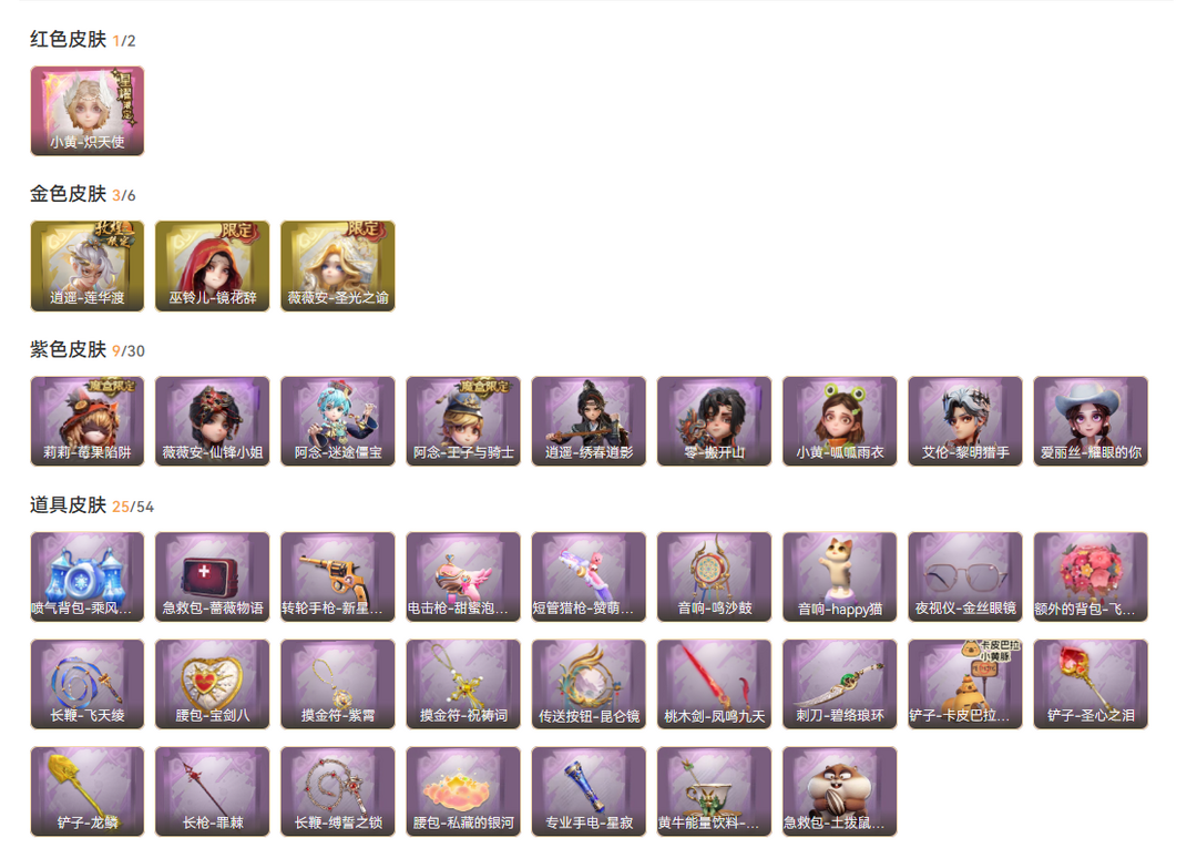 1星耀3金9紫25道具皮炽天使莲花渡圣光之谕镜花辞莓果陷阱仙锋小姐迷途僵宝搬开口绣春逍影黎明猎手