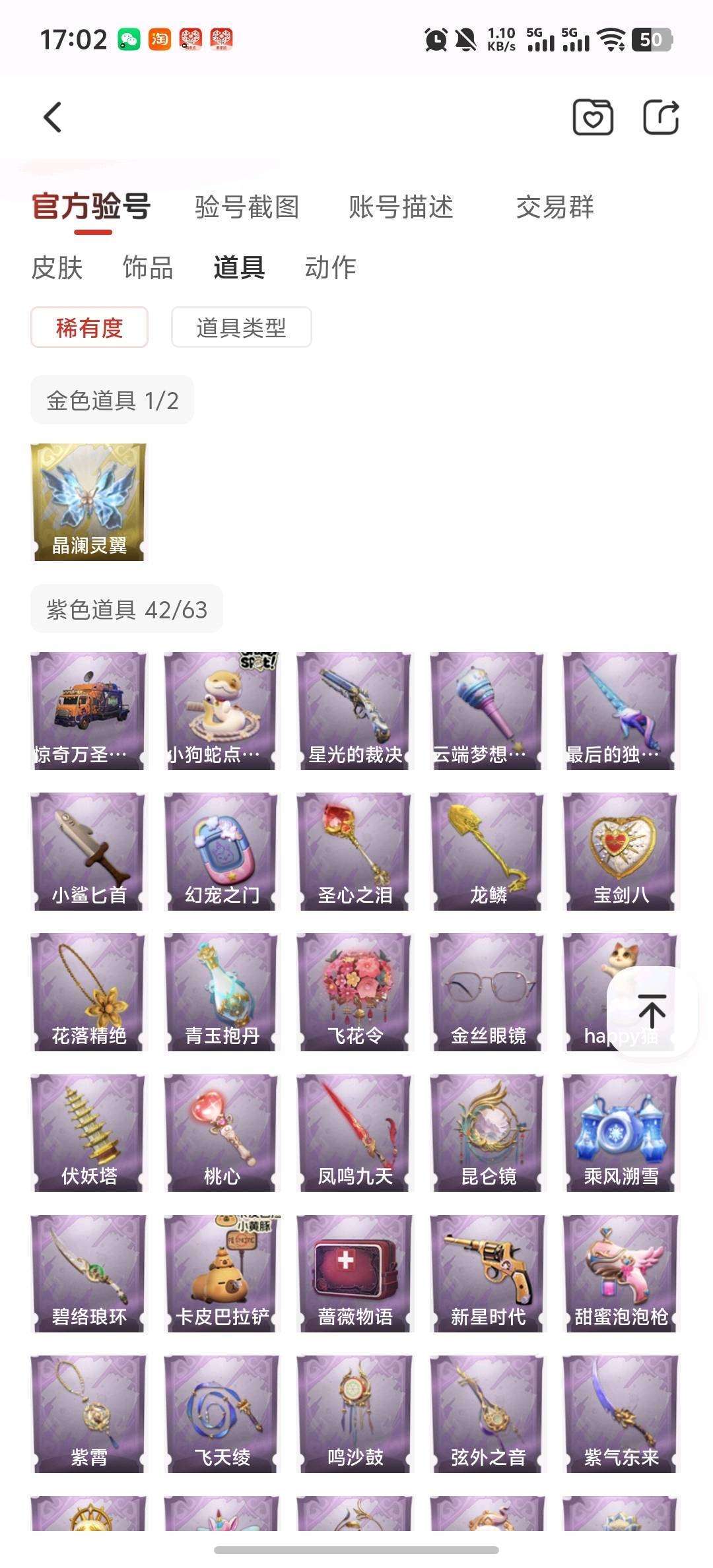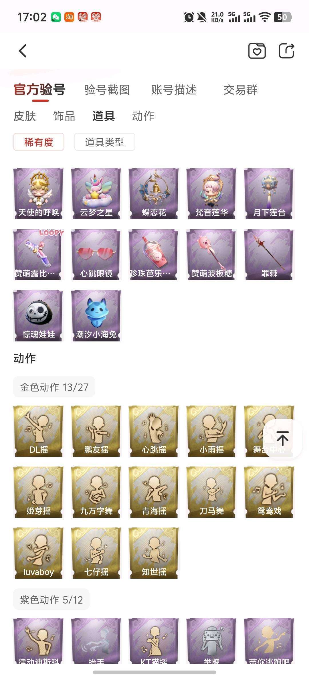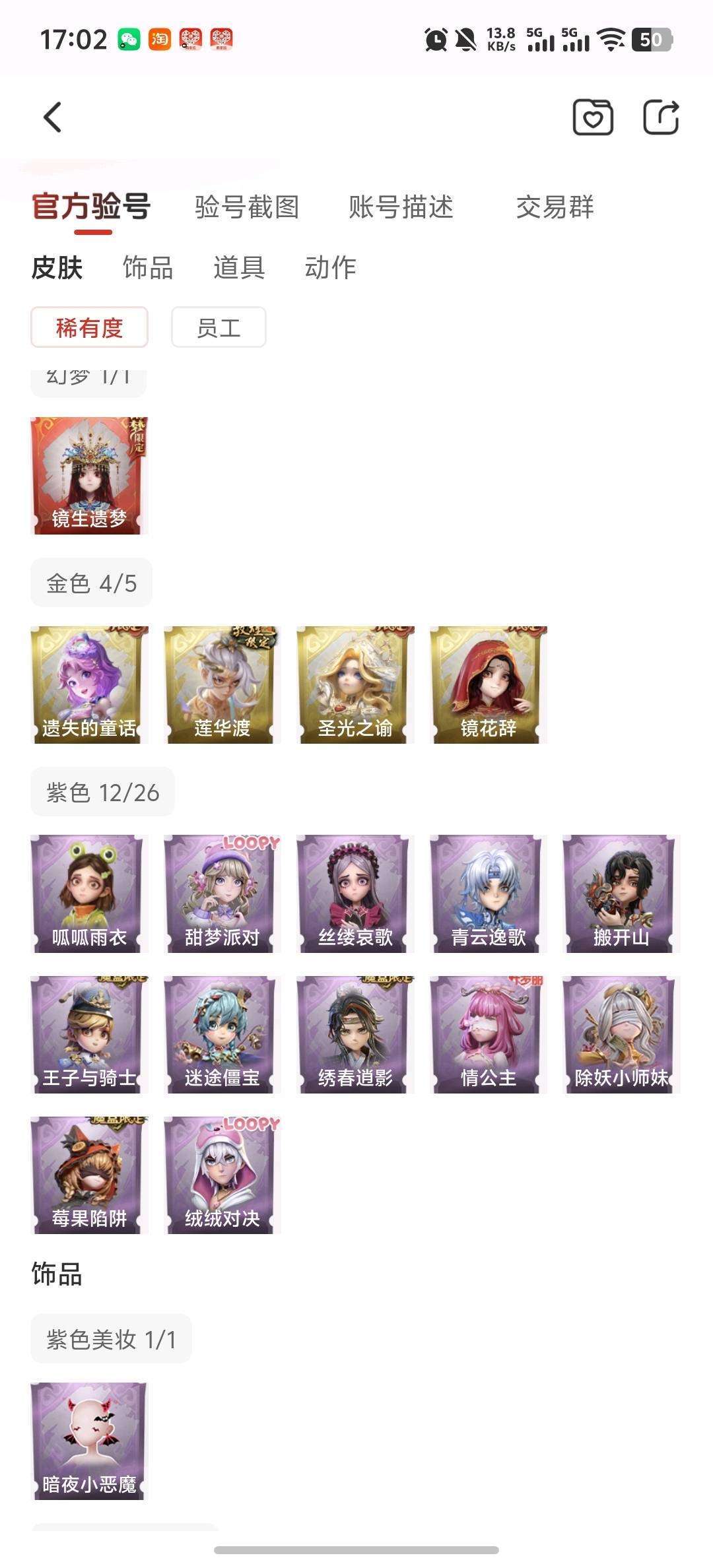 装备描述:【幻梦皮肤数量】1幻梦 【金色皮肤数量】5 【紫色皮肤数量】14 【道具皮肤数量】47 【累充】46190金砖 【赛季魔盒】稀世豪华魔盒 【员工】小黄、爱丽丝、零、阿念、逍遥、薇薇安、巫铃儿、莉莉、艾伦、爱德华、兰、小满 【幻梦皮肤】巫铃儿-镜生遗梦 【金色皮肤】零-渡鸦公爵、逍遥-莲华渡、薇薇安-圣光之谕、小黄-遗失的童话、巫铃儿-镜花辞 【紫色皮肤】艾伦-黎明猎手、兰-千夜星谕、零-搬开山、爱丽丝-甜梦派对、艾伦-绒绒对决、莉莉-莓果陷阱、阿念-迷途僵宝、莉莉-除妖小师妹、阿念-王子与骑士、莉莉-情公主、零-青云逸歌、爱丽丝-丝缕哀歌、逍遥-绣春逍影、小黄-呱呱雨衣 【道具皮肤】喷气背包-晶澜灵翼、专业手电-星寂、夜视仪-心跳眼镜、摸金符-紫霄、刺刀-小鲨匕首、短管猎枪-星光的裁决、急救包-蔷薇物语、腰包-月下莲台、刺刀-紫气东来、转轮手枪-新星时代、腰包-宝剑八、传送按钮-昆仑镜、桃木剑-凤鸣九天、桃木剑-绯色遗证、音响-鸣沙鼓、铲子-龙鳞、传送按钮-幻宠之门、音响-happy猫、喷气背包-乘风溯雪、长鞭-缚誓之锁、黄牛能量饮料-青玉抱丹、长鞭-飞天绫、