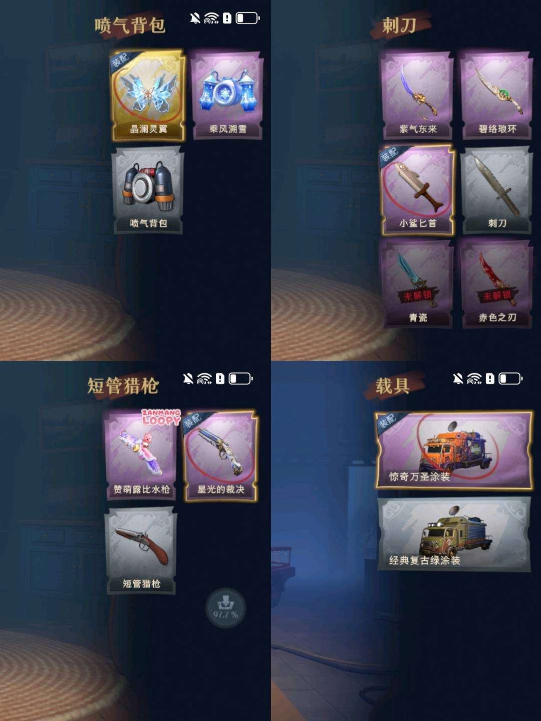装备描述:【幻梦皮肤】巫铃儿-镜生遗梦 【金色皮肤】零-渡鸦公爵、逍遥-莲华渡、薇薇安-圣光之谕、小黄-遗失的童话、巫铃儿-镜花辞 【紫色皮肤】艾伦-黎明猎手、零-搬开山、薇薇安-仙锋小姐、爱丽丝-甜梦派对、艾伦-绒绒对决、莉莉-莓果陷阱、阿念-王子与骑士、莉莉-情公主、逍遥-泽引山海、爱丽丝-瑞羽衔春、零-青云逸歌、爱丽丝-丝缕哀歌、逍遥-绣春逍影、小黄-呱呱雨衣 【道具皮肤】喷气背包-晶澜灵翼、音响-鸣沙鼓、传送按钮-昆仑镜、夜视仪-金丝眼镜、电击枪-甜蜜泡泡枪、长鞭-小狗蛇点点鞭、喷气背包-乘风溯雪、传送按钮-逆时审判、短管猎枪-星光的裁决、刺刀-紫气东来、黄牛能量饮料-青玉抱丹、短管猎枪-赞萌露比水枪、刺刀-碧络琅环、铲子-卡皮巴拉小黄豚铲、腰包-宝剑八、除颤仪-弦外之音、桃木剑-最后的独角兽、黄牛能量饮料-珍珠芭乐莓莓、额外的背包-飞花令、音响-happy猫、摸金符-紫霄、腰包-惊魂娃娃、专业手电-云端梦想计划、腰包-月下莲台、刺刀-小鲨匕首、铲子-龙鳞、葫芦-伏妖塔、桃木剑-凤鸣九天、铲子-赞萌波板糖、急救包-蔷薇物语、急救包-末章心跳、长鞭-飞天绫、转轮手枪-新星时代、背饰-子夜
