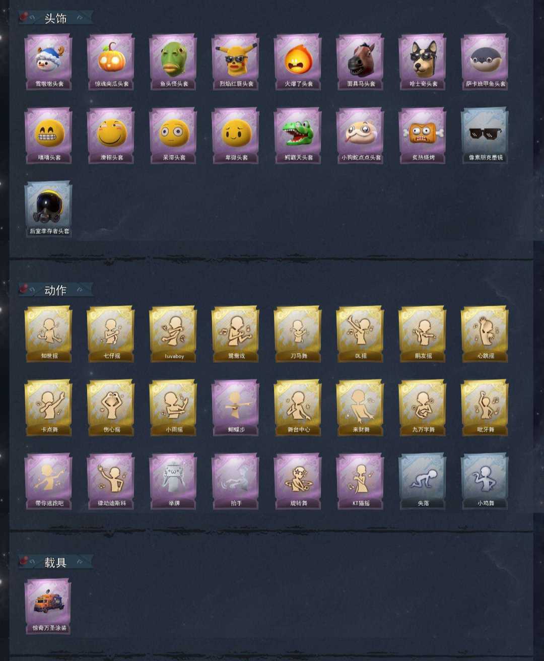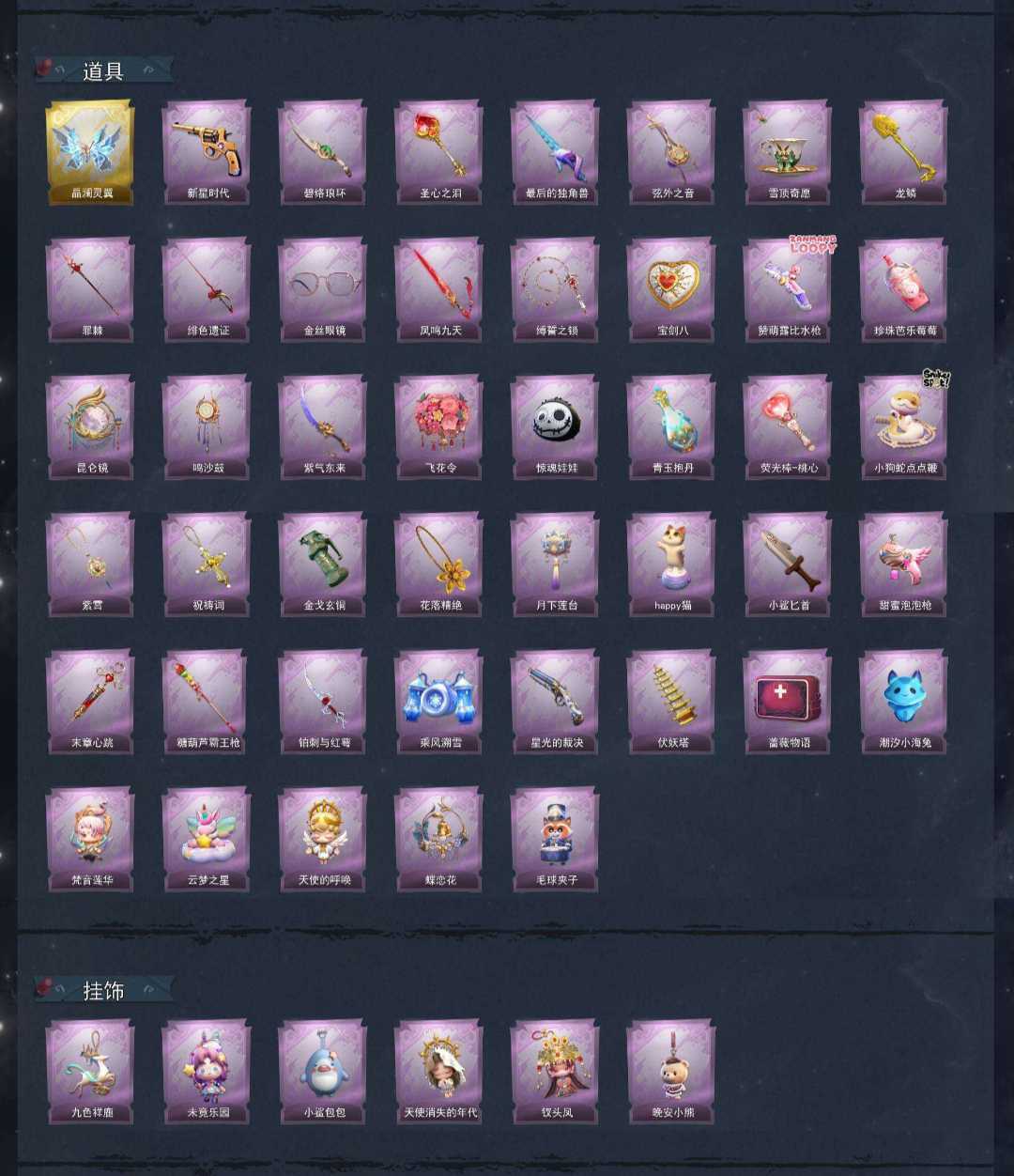装备描述:1红5金24紫皮⭐红皮+满抽镜花辞道具全有凤鸣九天⭐瑶台梦金皮⭐9逍遥金皮⭐满抽薇薇安金⭐满抽小黄金⭐绝版泽引山海白泽⭐绘梦厅露比水枪⭐满抽万圣节车皮+暗夜小恶魔⭐喷气背包乘风塑雪⭐小狗蛇鞭⭐鲨鱼匕首⭐家园梦居11级