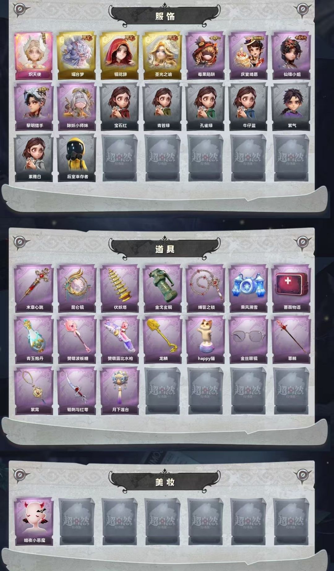 装备描述:星耀皮肤 小黄-炽天使 金色皮肤莉-瑶台梦薇薇安-圣光之谕,巫铃儿-镜花辞,莉 莉莉-除妖小师妹,莉莉-莓果陷阱,薇薇 紫色皮肤 安-仙锋小姐,艾伦-黎明猎手,阿念-庆宴 绮愿 长枪-罪棘,铲子-赞萌波板糖,铲子-龙鳞,传送按钮-昆仑镜,摸金符-紫霄,腰包-月下莲台,葫芦-伏妖塔,黄牛能量饮料-青 道具皮肤 玉抱丹,夜视仪-金丝眼镜,音响-happy 猫,喷气背包-乘风溯雪,急救包-蔷薇物语,短管猎枪-赞萌露比水枪,急救包-末章心跳,长鞭-缚誓之锁,刺刀-铂刺与红萼 卑微头套,呆滞头套,哈士奇头套,滑稽头套,烈焰红唇头套,嘻嘻头套,面具马 头饰 头套,鱼头怪头套,萨卡班甲鱼头套,精 致露比头套,惊魂南瓜头套,樱桃奶油布丁,雪墩墩头套,太空鲨头套, 挂饰 钗头凤 背饰子夜证词,牛啤背包蝶恋花,梵音莲华,班卓琴,尘封旧事, 金色动作仔摇,知世摇,孤身摇,不孬摇舞台中心,伤心摇,鹏友摇,鸳鸯戏,七 紫色动作 带你逃跑吧,要糖,抬手,举牌,蝴蝶步 员工爱德华,兰,零,小满,小黄,爱丽丝阿念,逍遥,薇薇安,巫铃儿,莉莉,艾伦,