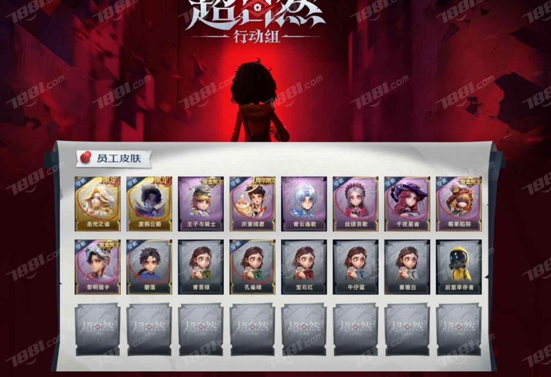 装备描述:【段位:王牌 员工:阿念,爱丽丝,逍遥,薇薇安,兰,莉莉,巫铃儿,零,艾伦,小满,爱德华 ,小黄 员工皮肤:渡鸦公爵,圣光之谕,千夜星谕,莓果陷阱,王子与骑士,青云逸歌,丝缕哀歌 道具皮肤:传送按钮-逆时审判,急救包-末章心跳,长鞭-小狗蛇点点鞭,短管猎枪-星光的裁决,夜视仪-金丝眼镜,音响-happy猫,音响-鸣沙鼓,荧光棒-桃心,转轮手枪-新星时代,急救包-蔷薇物语 头饰:惊魂南瓜头套,炙热烧烤,呆滞头套,嘻嘻头套,哈士奇头套,面具马头套,滑稽头套,鱼头怪头套,卑微头套,烈焰红唇头套,萨卡班甲鱼头套,火爆了头套,小狗蛇点点头套 挂饰:尘封旧事,未竟乐园,钗头凤 动作金色:胜利之舞,卡点舞,小雨摇,舞台中心,来财舞,星奇摇,老鼠舞,心跳摇 动作紫色:抬手,带你逃跑吧,律动迪斯科,山楂树之舞,晚安公主舞,痞帅进行曲,人皇步 背饰:梵音莲华,子夜证词】双金皮,6紫皮