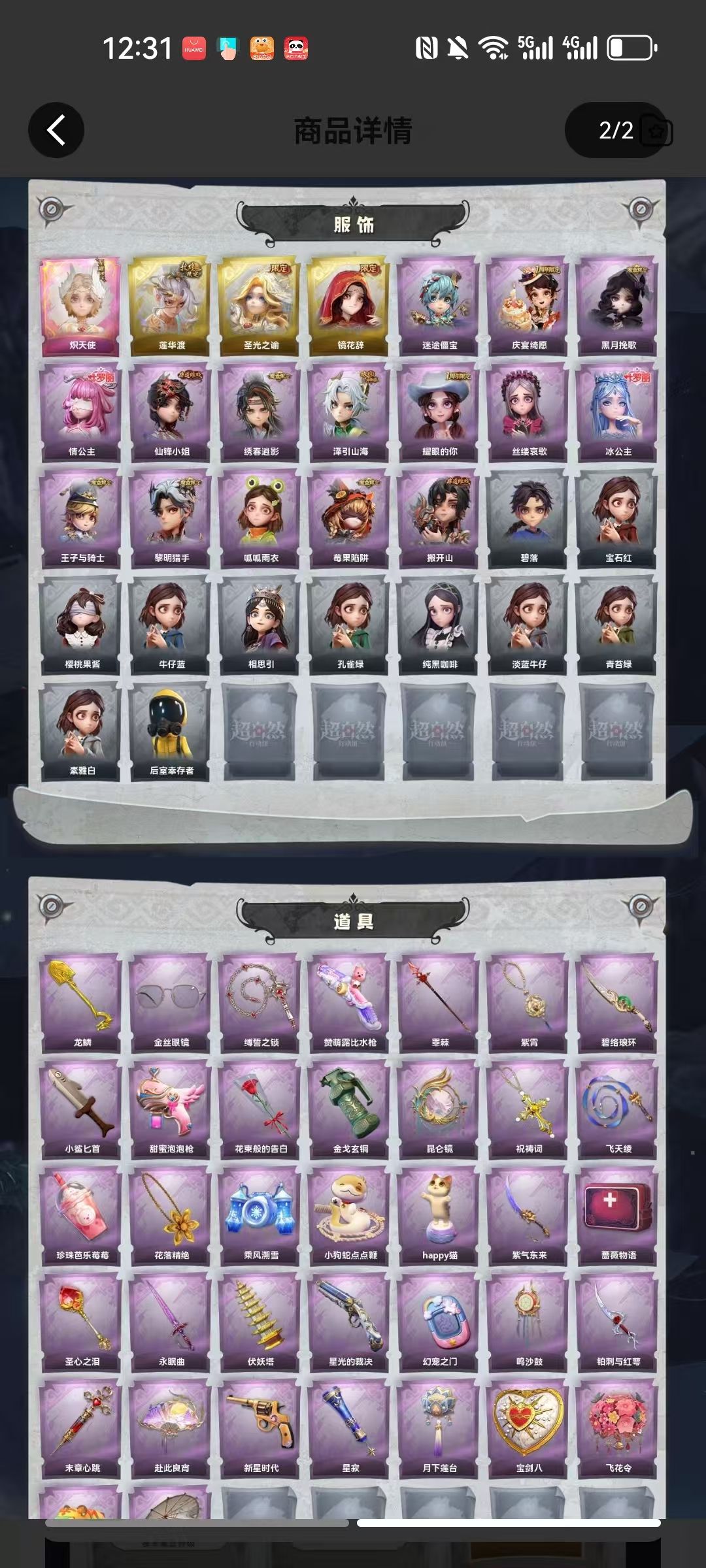 装备描述:皮肤:小黄-炽天使,逍遥-莲华渡,薇薇安-圣光之谕,巫铃儿-镜花辞,阿念-迷途僵宝,阿念-庆宴绮愿,薇薇安-黑月挽歌,莉莉-情公主,薇薇安-仙锋小姐,逍遥-绣春逍影,逍遥-泽引山海,爱丽丝-耀眼的你,爱丽丝-丝缕哀歌,爱丽丝-冰公主,阿念-王子与骑士,艾伦-黎明猎手,小黄-呱呱雨衣,莉莉-莓果陷阱,零-搬开山;道具:铲子-龙鳞,夜视仪-金丝眼镜,长鞭-缚誓之锁,短管猎枪-赞萌露比水枪,长枪-罪棘,摸金符-紫霄,刺刀-碧络琅环,刺刀-小鲨匕首,电击枪-甜蜜泡泡枪,专业手电-花束般的告白,闪光弹-金戈玄铜,传送按钮-昆仑镜,摸金符-祝祷词,长鞭-飞天绫,黄牛能量饮料-珍珠芭乐莓莓,摸金符-花落精绝,喷气背包-乘风溯雪,长鞭-小狗蛇点点鞭,音响-happy猫,刺刀-紫气东来,急救包-蔷薇物语,铲子-圣心之泪,桃木剑-永眠曲,葫芦-伏妖塔,短管猎枪-星光的裁决,传送按钮-幻宠之门,音响-鸣沙鼓,刺刀-铂刺与红萼,急救包-末章心跳,折扇-赴此良宵,转轮手枪-新星时代,专业手电-星寂,腰包-月下莲台,腰包-宝剑八,额外的背包-飞花令,腰包-红运福虎,伞-伞;美妆:美妆-暗夜小恶魔;