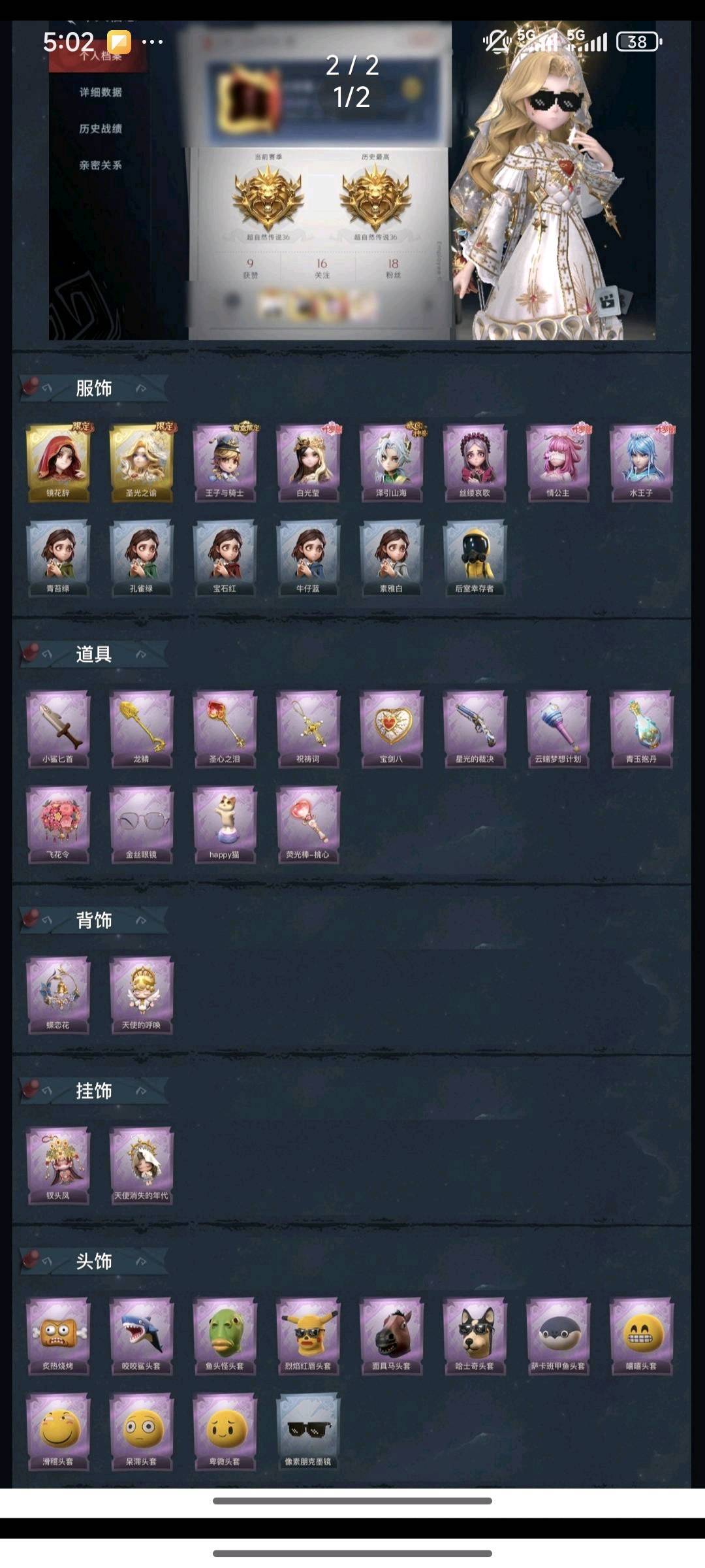 装备描述:金皮2紫皮6,道具皮12,巫铃儿-镜花辞,薇薇安-圣光之谕,泽引山海 情公主 水王子 白光莹
