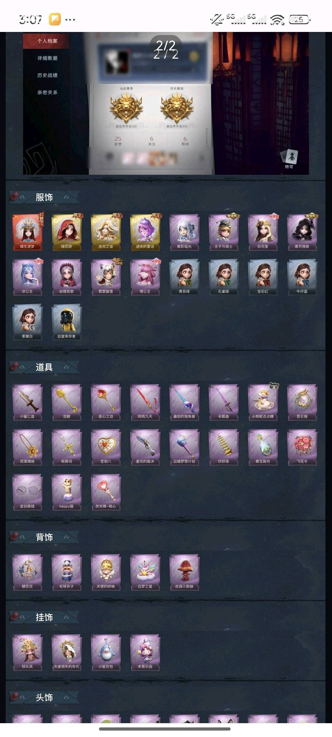 装备描述:红皮1金皮3紫皮8,道具皮19,巫铃儿-镜生遗梦,巫铃儿-镜花辞,薇薇安-圣光之谕,小黄-遗失的童话