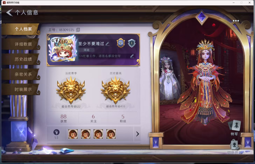 段位:超自然传说,皮肤∶镜生遗梦,镜花辞,遗失的童话,圣光之谕,情公主