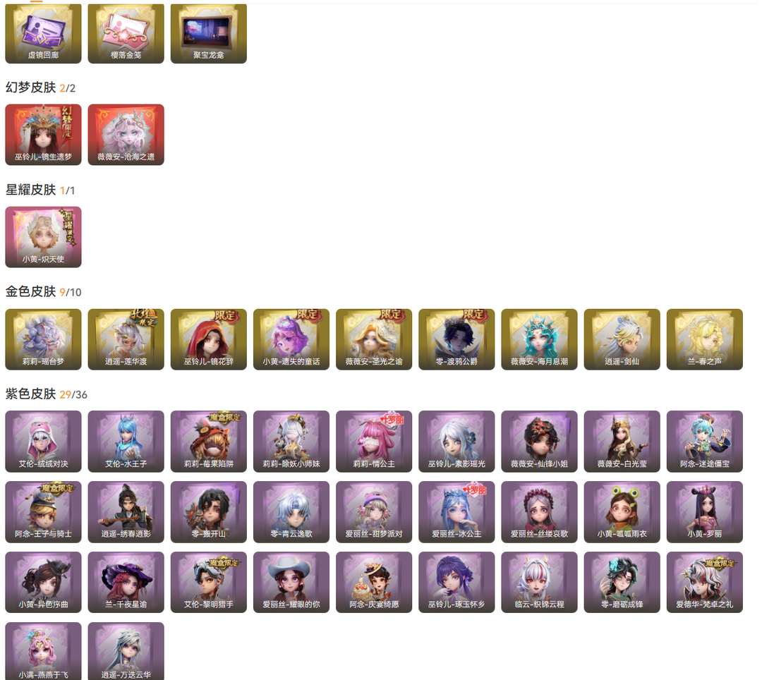 限制: 撤单率<68%才可租用此帐号装备描述:【满氪条2红1星耀9金32紫皮68道具58饰品】 星耀皮肤 小黄-炽天使 幻梦皮肤 巫铃儿-镜生遗梦、薇薇安-沧海之遗 金色皮肤 薇薇安-圣光之谕、小黄-遗失的童话、巫铃儿-镜花辞、逍遥-莲华渡、零-渡鸦公爵、莉莉-瑶台梦、逍遥-剑仙、薇薇安-海月息潮、兰-春之声 紫色皮肤 小黄-异色序曲、小黄-罗丽、小黄-呱呱雨衣、爱丽丝-丝缕哀歌、爱丽丝-冰公主、零-青云逸歌、阿念-王子与骑士、阿念-迷途僵宝、逍遥-绣春逍影、薇薇安-白光莹、巫铃儿-素影瑶光、莉莉-情公主、莉莉-除妖小师妹、莉莉-莓果陷阱、艾伦-水王子、艾伦-绒绒对决、爱丽丝-甜梦派对、薇薇安-仙锋小姐、零-搬开山、兰-千夜星谕、艾伦-黎明猎手、阿念-庆宴绮愿、爱丽丝-耀眼的你、零-磨砺成锋、临云-织锦云程、巫铃儿-琢玉怀乡、爱德华-梵卓之礼、逍遥-万迭云华、小满-燕燕于飞
