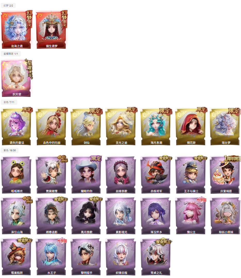 满图鉴✨晶澜灵翼✨3红7金19紫✨非遗皮沧海之遗✨剑仙✨瑶台梦✨血色玛丽✨赤炼将军✨泽引山海✨绣春逍