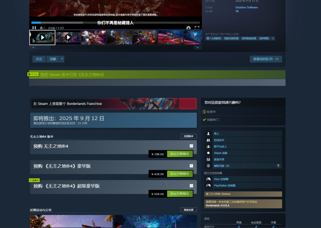 《无主之地4》558元-预购-超级豪华版!全DLC!商城清空!光辉包、赏金包、火鹰、秘藏包、华美教包