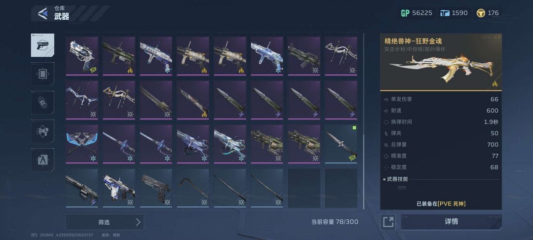 装备描述:传说武器:精绝兽神-狂野金魂 战争矩阵 死神猎手-眩紫狂潮 幽冥毒皇 冥河之矛 纯白至上 副武器:振弦 苔色暴风 乘风快递 传说近战:死亡之拥 沙暴冷锋 武装斧头 史诗近战:百炼钢管 沙蚀重刀 利齿 寒针 钢脊 尸龙战斧 陷阱皮肤:天启-丹凤朝阳 角色:雪莉杨 贝拉 万飞-时序特警 塔防装置枪:过载 塔防全陷阱 禁止分解插件