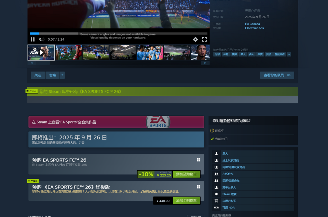 FIFA26【EA SPORTS FC 26】终极版!可提前7天玩!含EAplay!可玩所有EA游戏