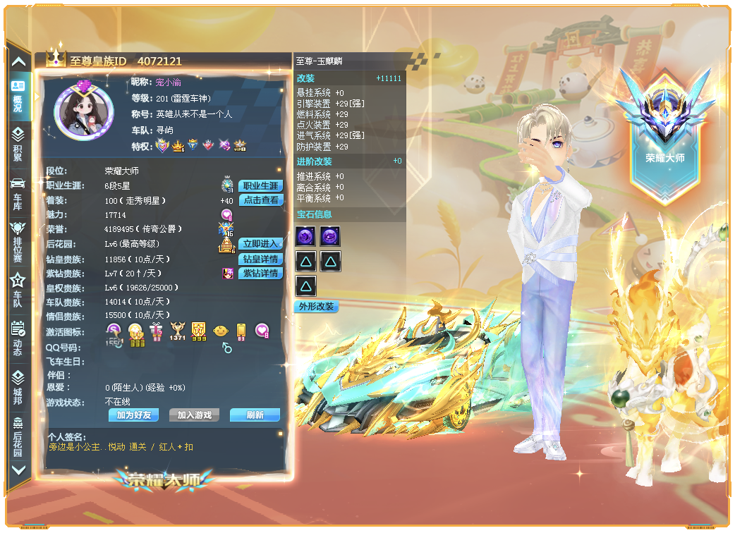 装备描述:电信一区:7S至尊玉麒麟全29双4、众神之神《麒麟》全29双4、爆天甲《奥丁》全29双4、至尊王者剃刀全29双4丶镇海之戟高改,暴风雪,S车全部激活10、T2赤焰修罗、T1神影之尊、A裁决者满改,穿梭者,雷诺《6级幻夜》全29双4其他A看图。C飞碟、女套装25页《4套悬浮动作》男套装42页《6套悬浮动作》宠物仙兽麒麟+10