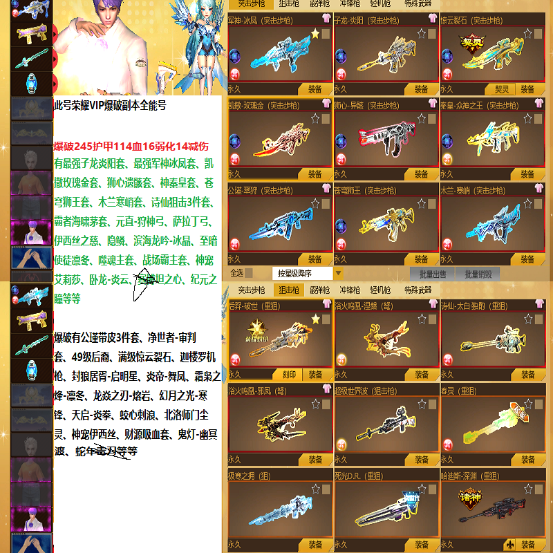 装备描述:全能顶配号,此号卖3588元喜欢的可以淘宝找唯一反恐行动账号交易