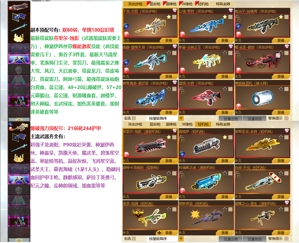装备描述:全能顶配号,不管是爆破副本,都顶配,上不去号的老板看角色名,协助上号