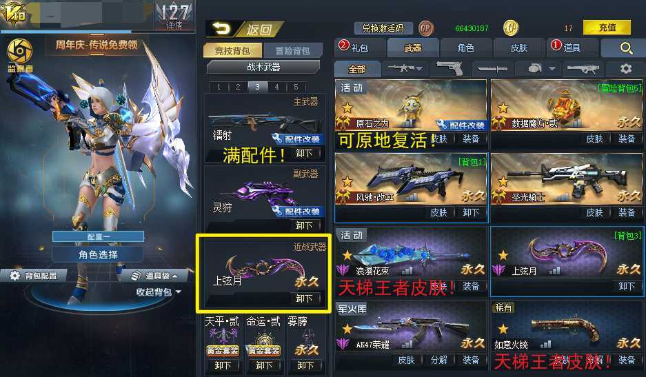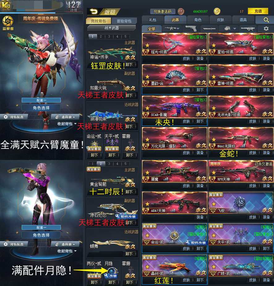 装备描述:[生死狙击网页版]分区全是账号密码登录的! [生死狙击网页版]分区全是账号密码登录的! [生死狙击网页版]分区全是账号密码登录的! v10! 天梯王者皮肤全满! 火铳-原石之怒-花束! 传说:墨韵合!瑶光终焉!星珀终焉!雷神终焉!未央影魔!金蛇无限ex!无尽终焉!万化无限!血魔!AK+RPK天神! 彩金:飞梭!红莲晶刹二!命运二!天平二!广陵二!两仪二!撼天一!暗水晶二!杀戮之海二… 满配件英雄级武器:尘埃!空间掌握者!浪淘沙!不朽!镭射!翎羽!234含光承影!戏法幻刃!虚空之矛!仲裁巨剑!幻锋!天火使者!飞星!伯言!星斗!月隐!蝶舞!岚翼!美杜莎!乾坤!棱晶!英勇比伯!领域!123白龙!12原石之力! 十二时辰黄金弩箭!上弦月!数据魔方二!满天赋魔童! 白骨夫人!潘多拉母体!异虫体!子母寄生体 请注意以下几点永久加入黑名单方式(再也租不了我的号了) 1.密码正确维quan密码错误 2.维quan被顶号(本号主实现一单一密码不存在被顶号)如恶意维quan顶号直接永久黑名单 3.重置二级密码,我会按时间推算找到那个租号的大概时间然后加入黑名单 4.请勿拿本号跟别人换号之类的