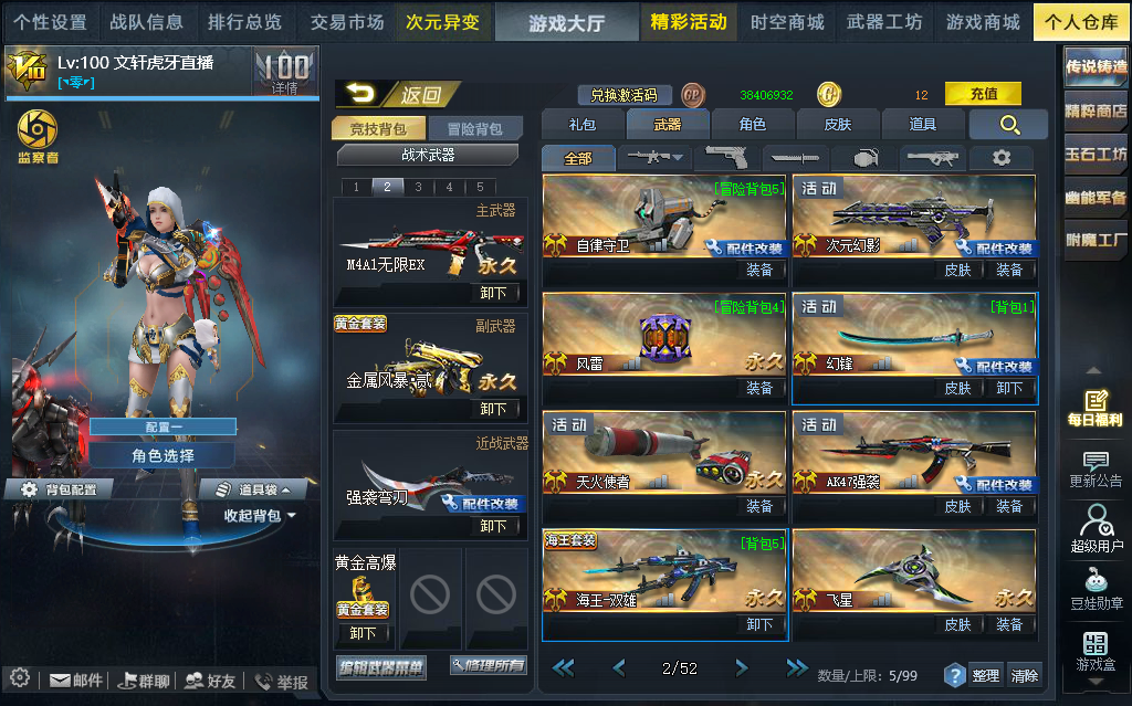 装备描述:3传说、42英雄、84黄金、战力:20W、M4A1无限EX、屠魔、AK47天神、幻锋、充值3.6万人民币
