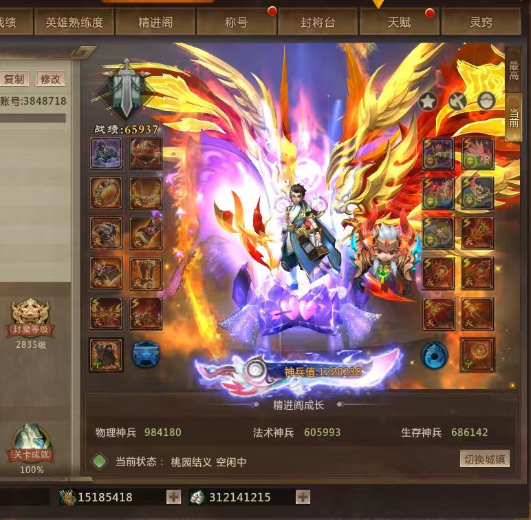 限制: 撤单率<80%才可租用此帐号装备描述:桃园玩具物理(年少韩当) 122W神兵 双令尊双神话 破甲 396爆伤 宠物 鬼帅 狐狸 月仙 龙人 玩具有幻神 魅力双持 金星月 用神剑 奶糖 九尾 大圣翅膀 猪猪 567皮肤 至尊4 详细看图