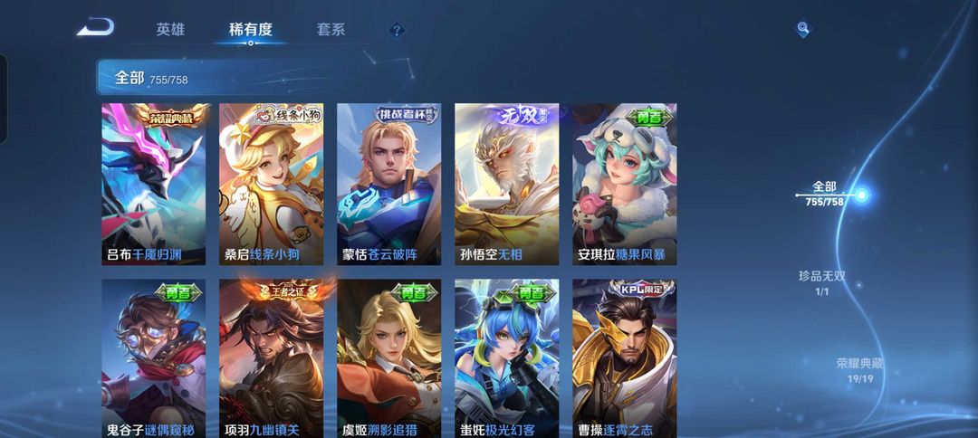 755皮|不禁言|只缺①皮肤〖吕布典藏❤悟空无相〗满典藏✨满按键✨满无双✨满珍品✨满传说✨满蛇年