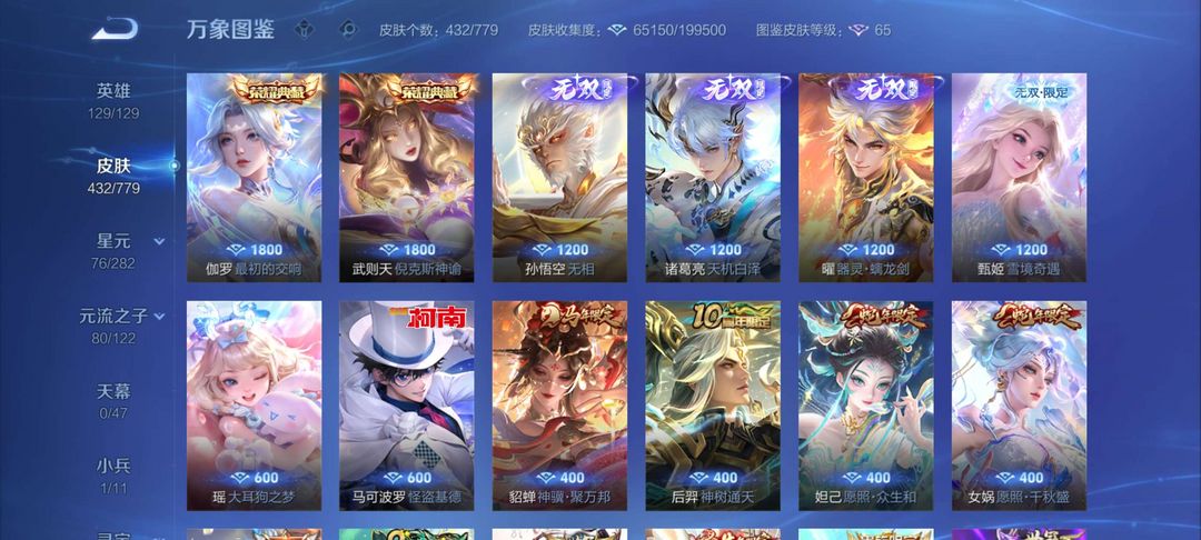 主要有法师和打野皮肤多 典藏倪克斯神谕伽罗最初的交响无双诸葛亮白泽 耀螭龙剑冰雪奇缘怪盗基德