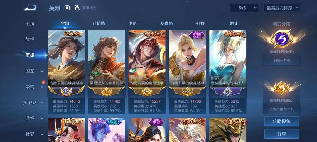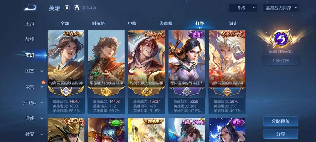 现省5曜省50霏历史国50强1.5w曜1.4霏1.3虎现打野巅峰万强打野皮基本都有国服曜