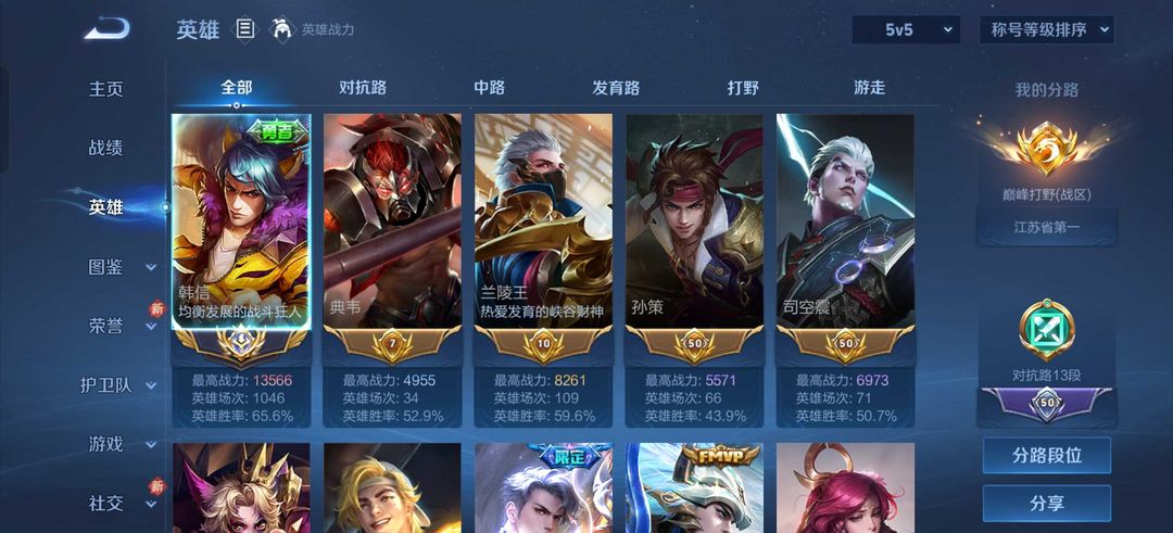 高胜率韩信低价租⭐抢先服1.3w大国标韩信⭐打野绝活哥⭐梦泪手打号⭐带妹必备⭐