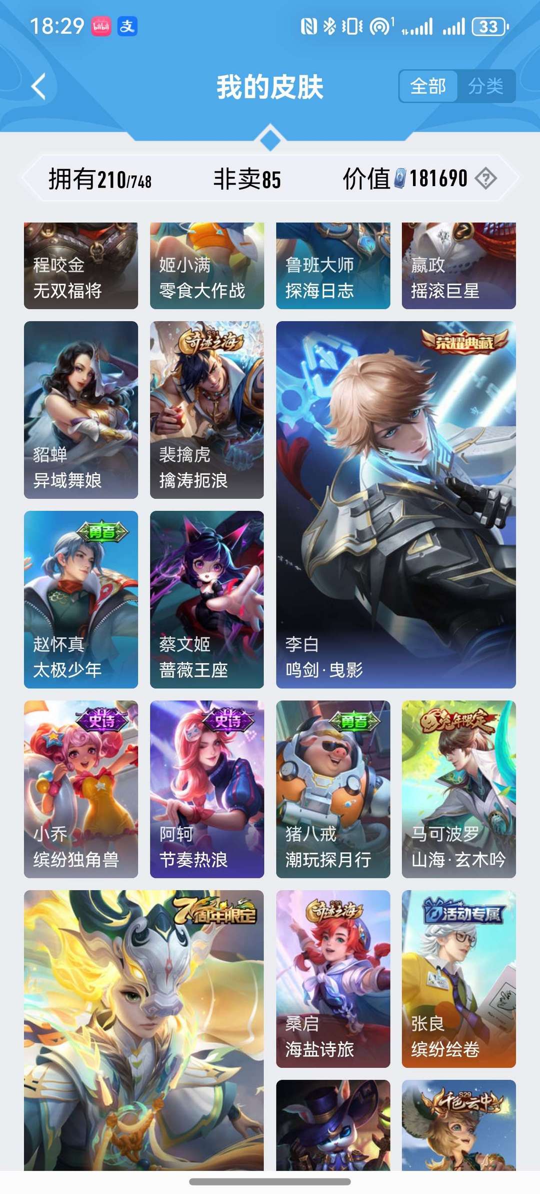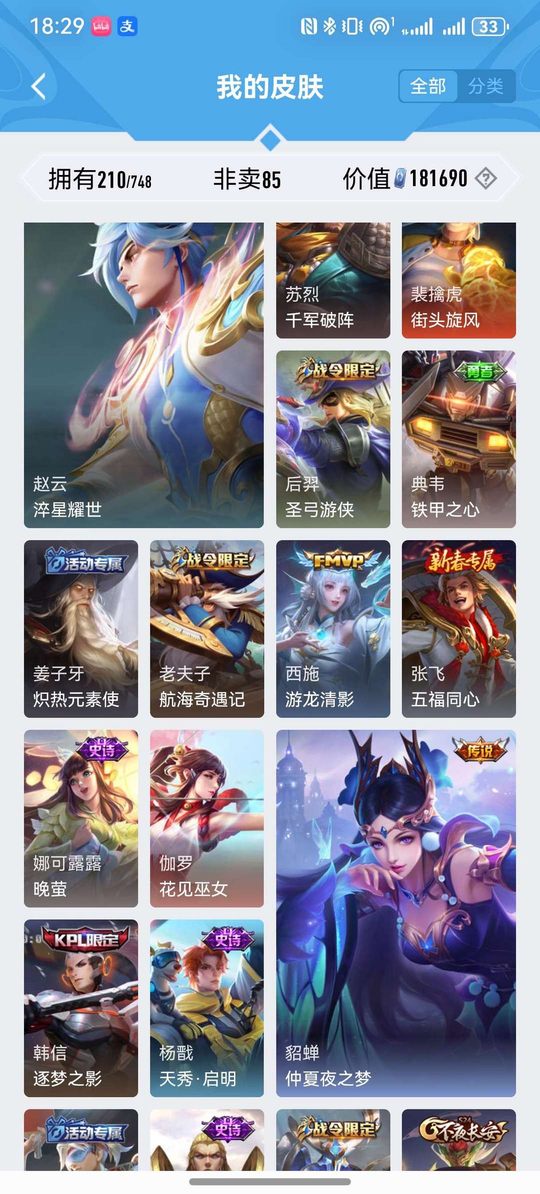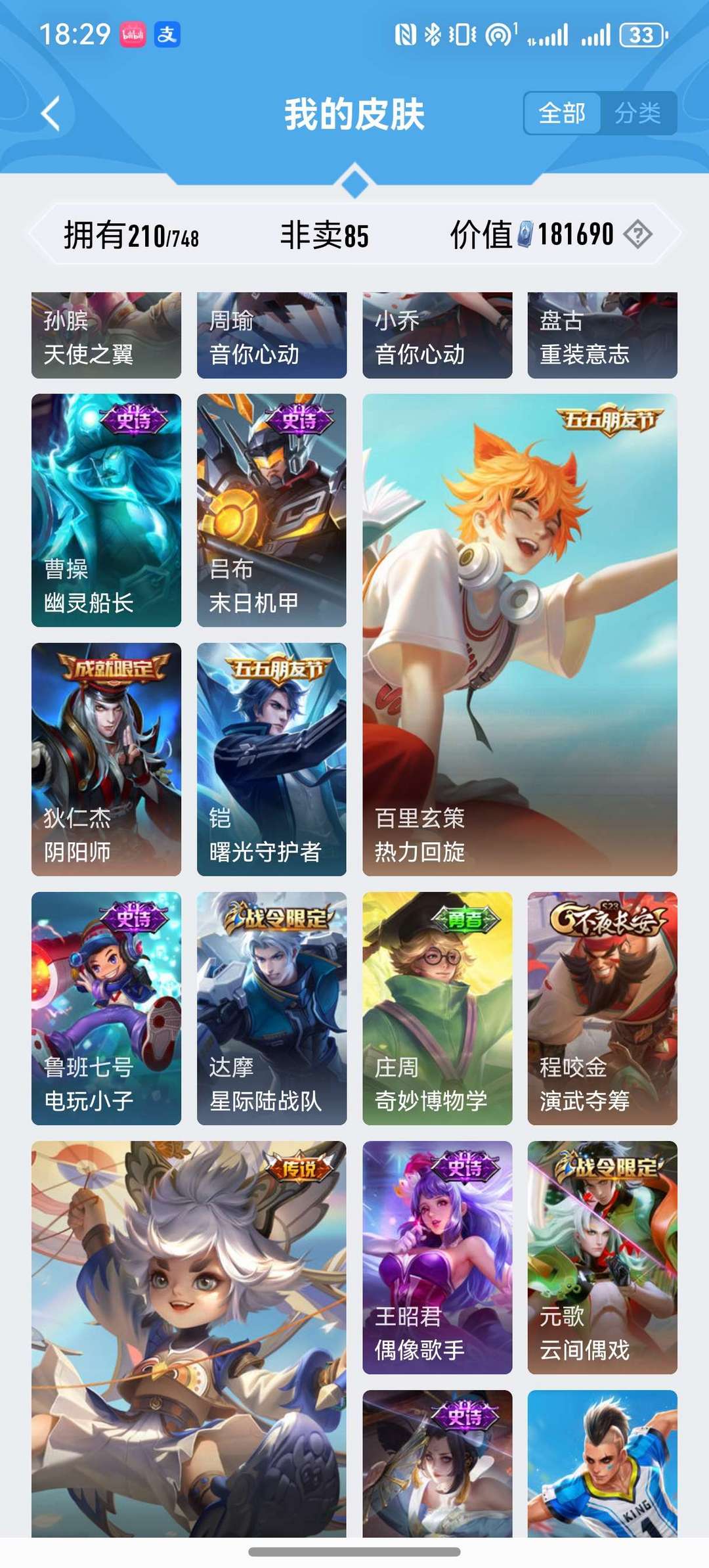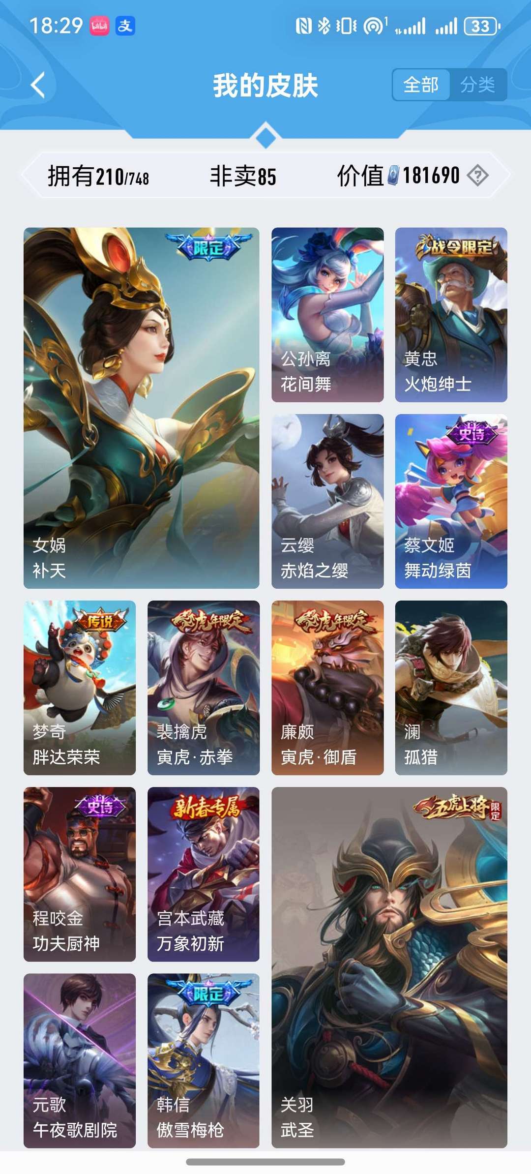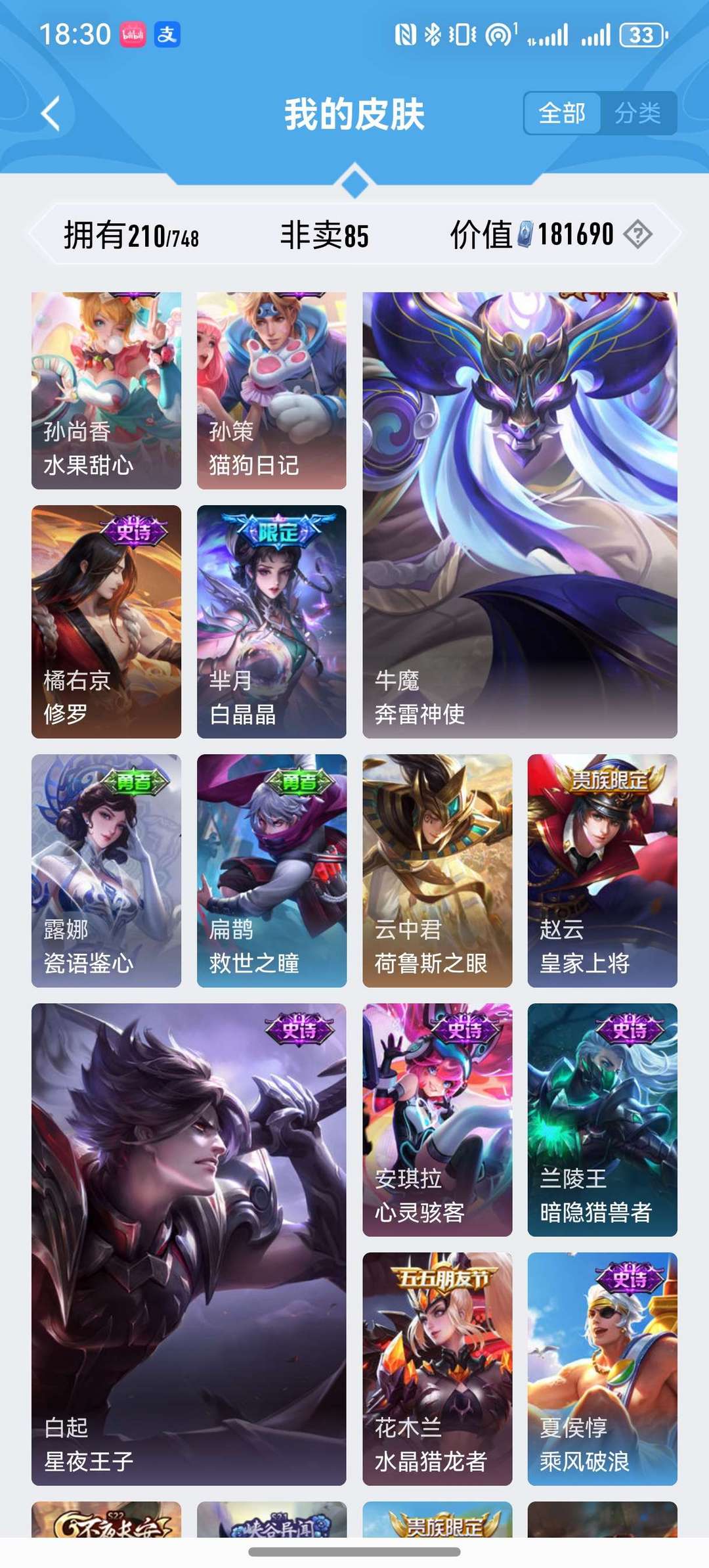 装备描述:私人所属英雄皮肤有:李白 鸣剑·曳影周瑜 音你心动梦奇 胖达荣荣李信 一念神魔关羽 武圣诸葛亮 武陵仙君李元芳 飞鸢探春狄仁杰 超时空战士虞姬 启明星使貂蝉 仲夏夜之梦孙策 挚爱之约赵云 淬星耀世女娲 补天曜 李逍遥小乔 音你心动裴擒虎 寅虎·赤拳伽罗 太华等等禁止利用账号进行开挂、使用辅助违规软件诈骗等违规操作