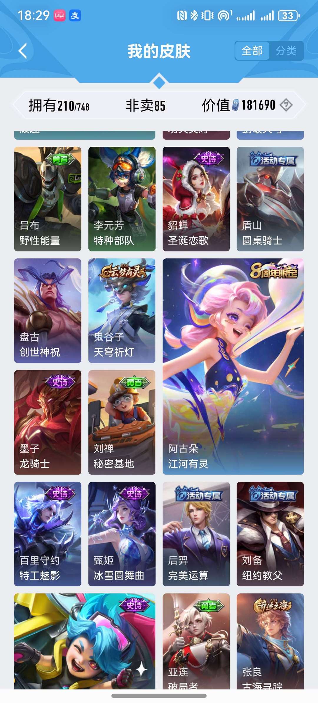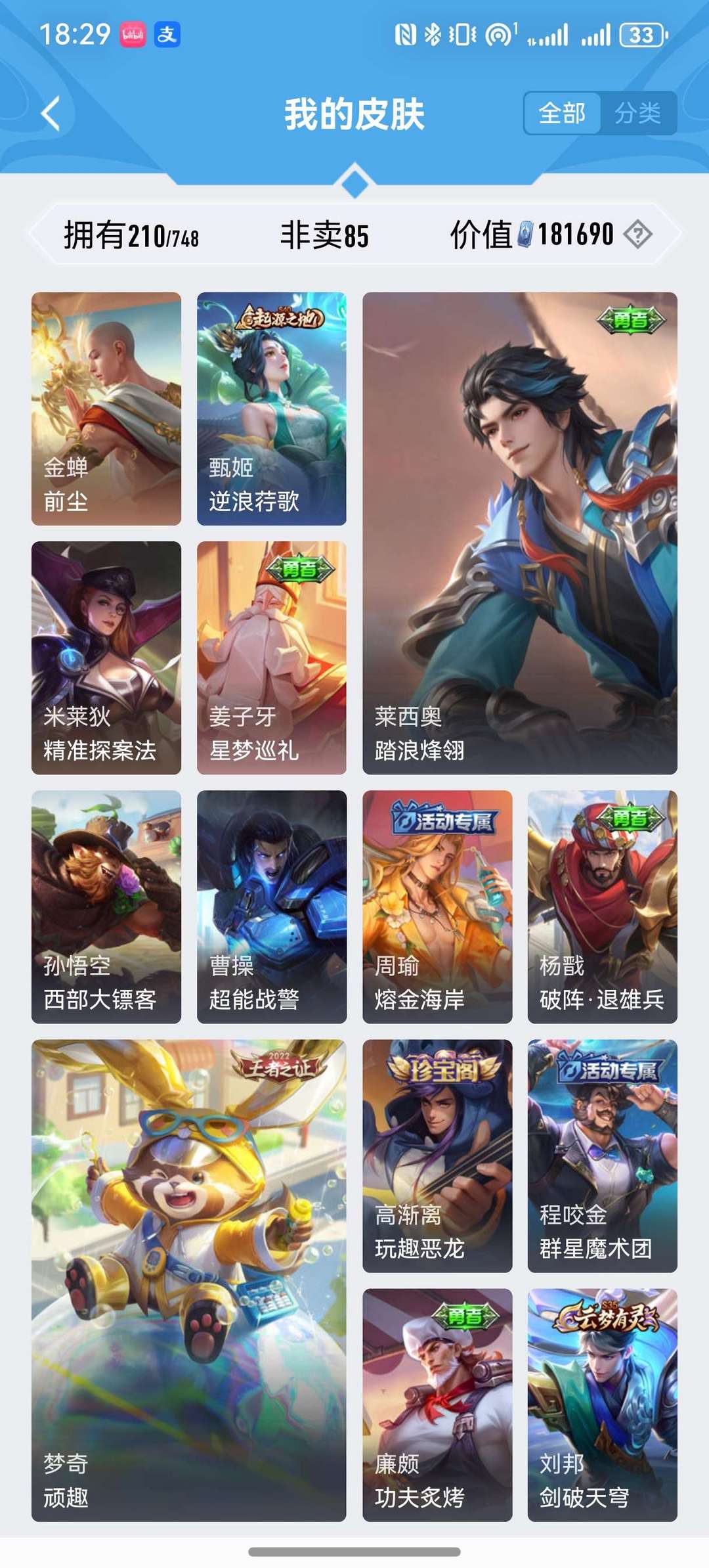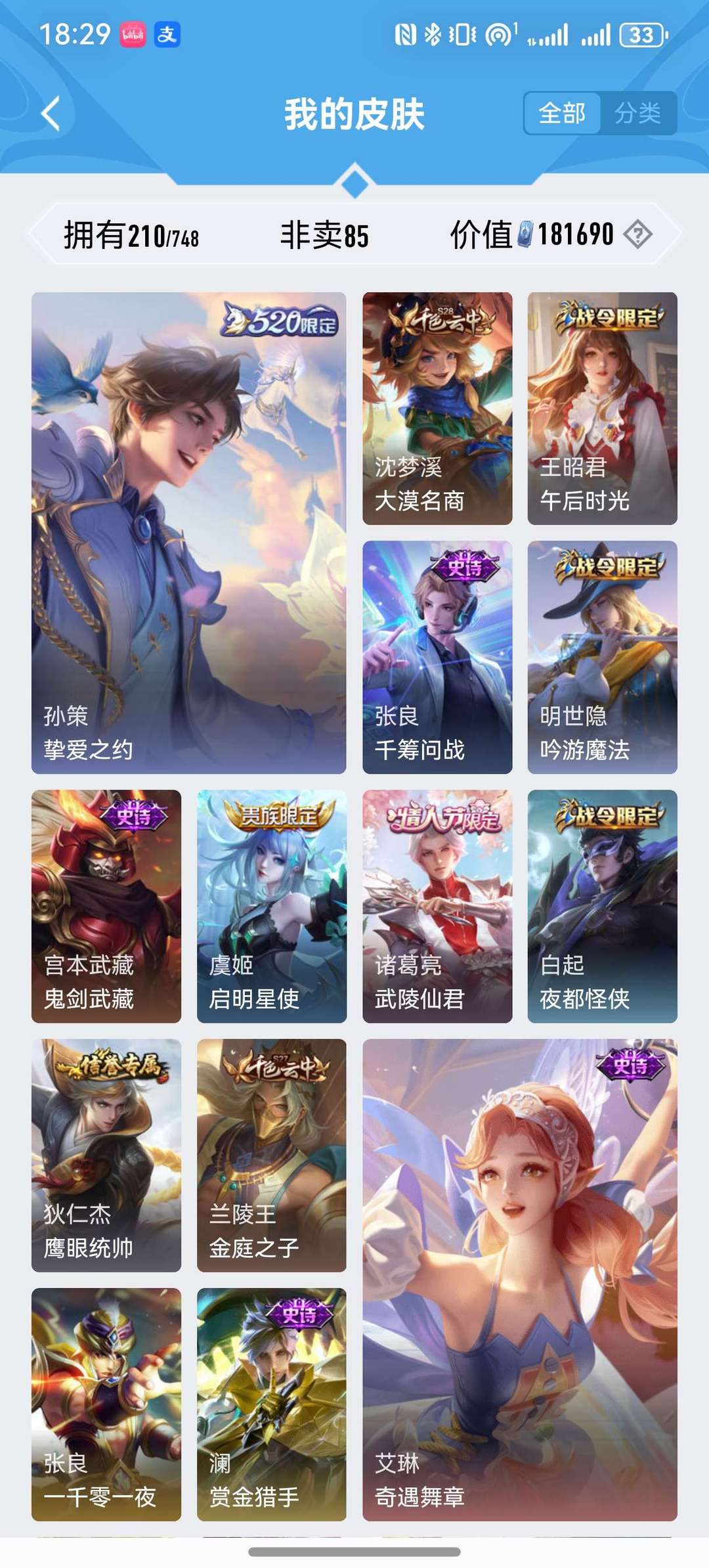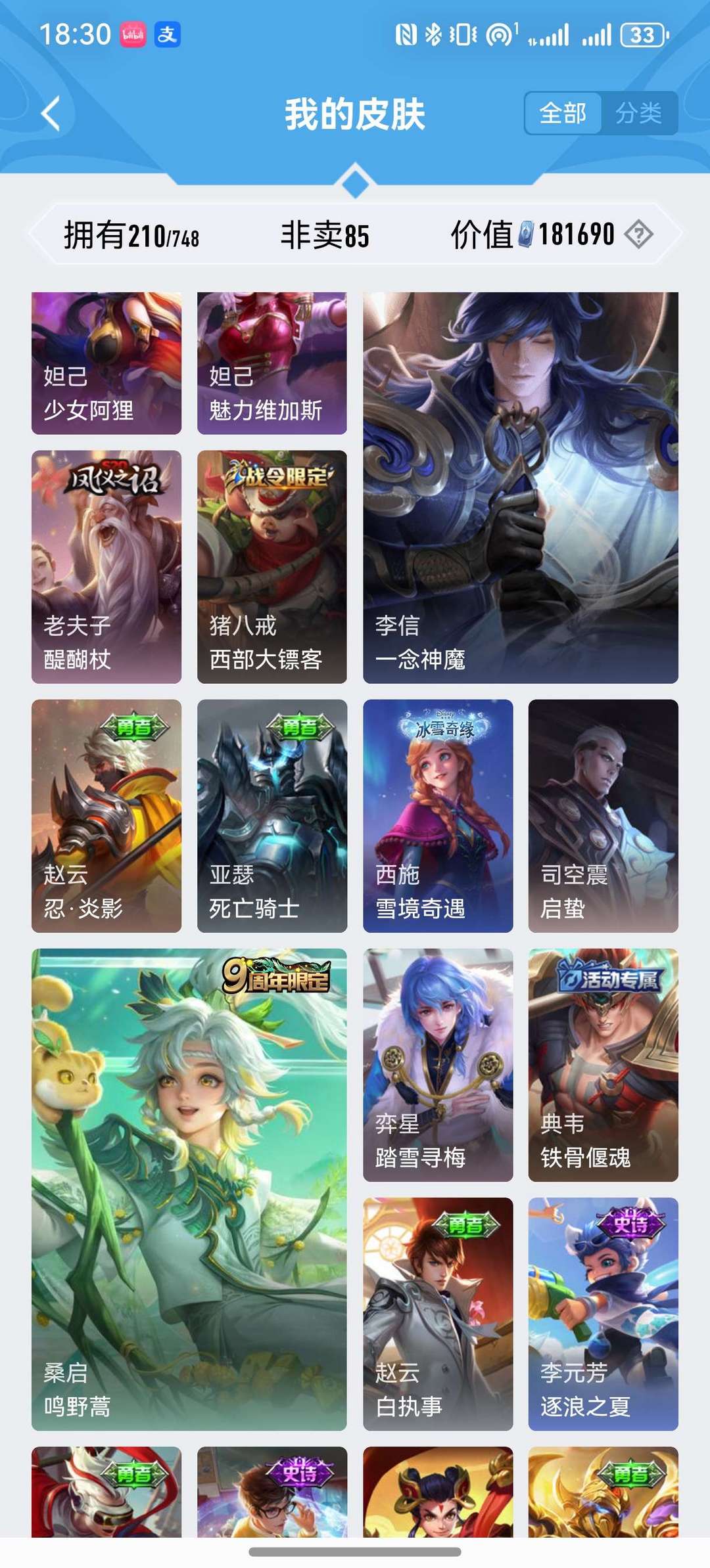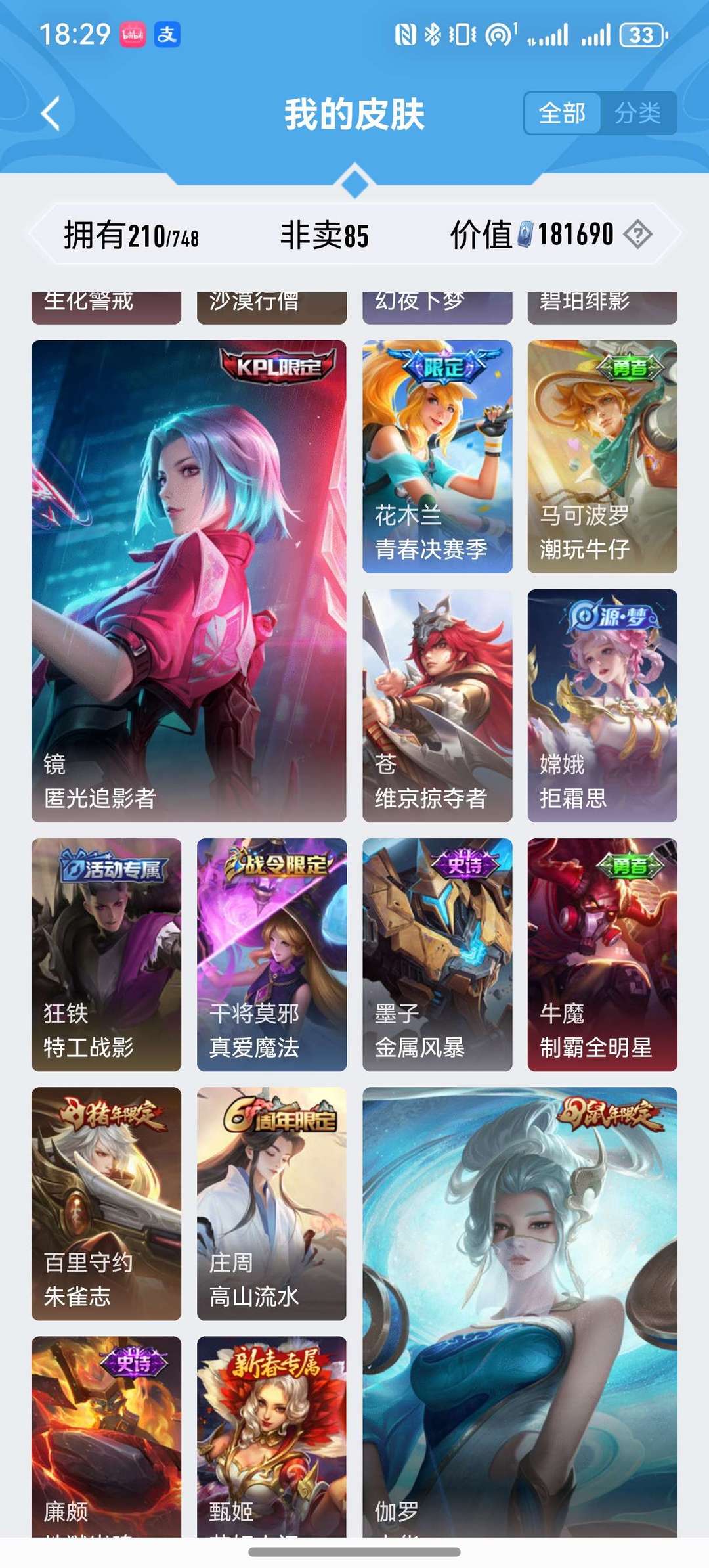装备描述:私人所属英雄皮肤有:李白 鸣剑·曳影周瑜 音你心动梦奇 胖达荣荣李信 一念神魔关羽 武圣诸葛亮 武陵仙君李元芳 飞鸢探春狄仁杰 超时空战士虞姬 启明星使貂蝉 仲夏夜之梦孙策 挚爱之约赵云 淬星耀世女娲 补天曜 李逍遥小乔 音你心动裴擒虎 寅虎·赤拳伽罗 太华等等禁止利用账号进行开挂、使用辅助违规软件诈骗等违规操作