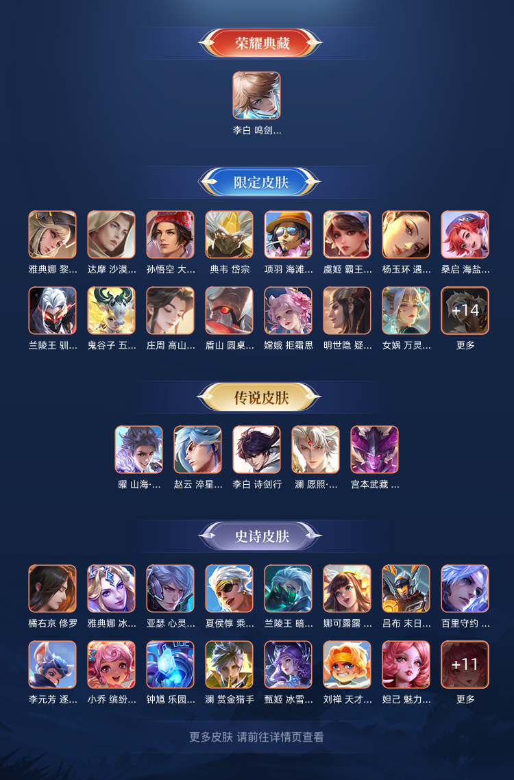 装备描述:李白【鸣剑曳影】孙尚香【 问璇玑】裴擒虎【 赤拳 】赵云【淬星耀世】曜【 山雷引】 虞姬【霸王别姬】典韦【 岱岳 】孙悟空【大圣娶亲 】雅典娜【神奇女侠】宫本武藏【地狱之眼】等228个皮肤可排位