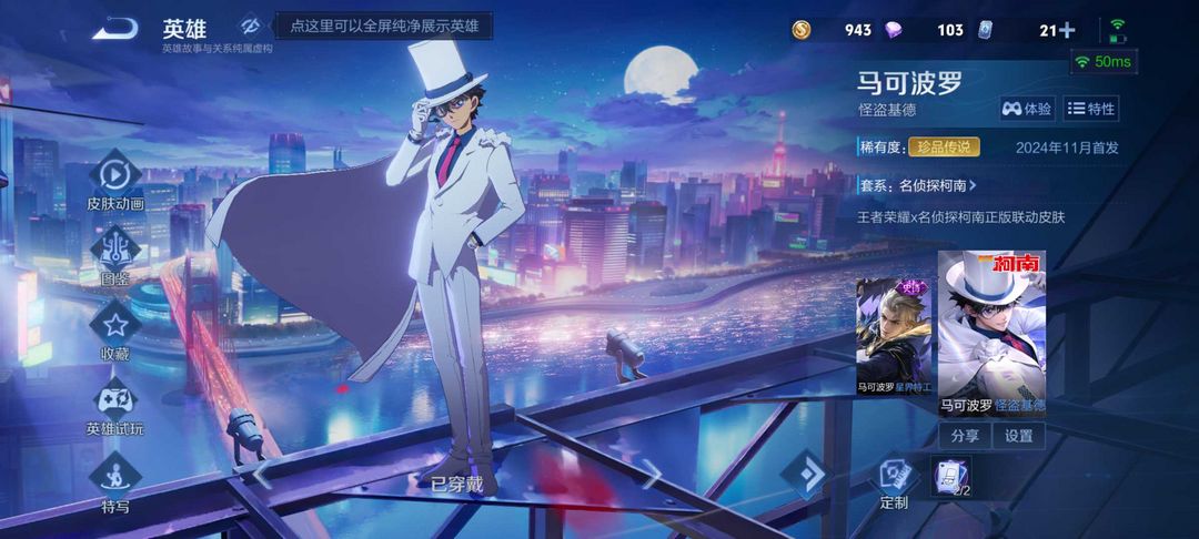 【V7 128皮】女号/典藏全息碎影/马可怪盗基德/铭文150/星耀五