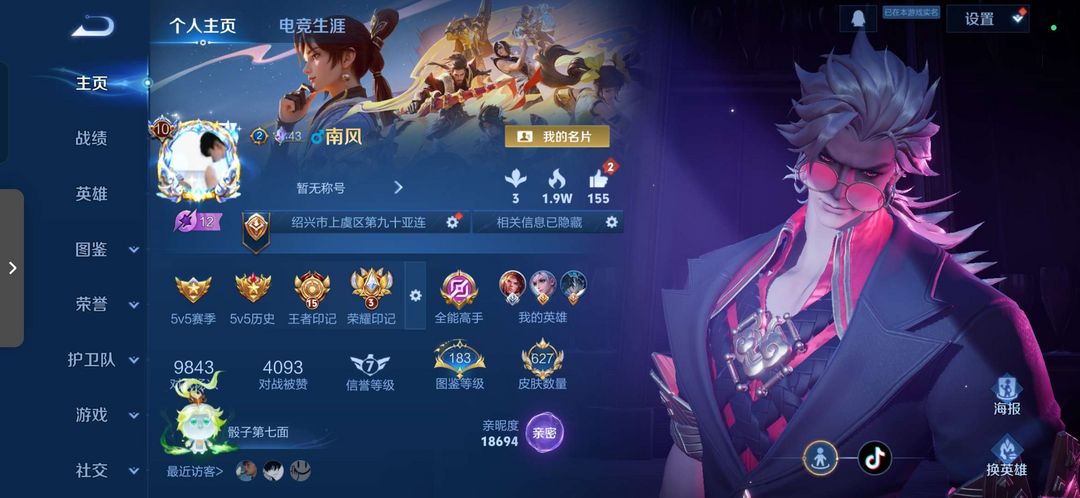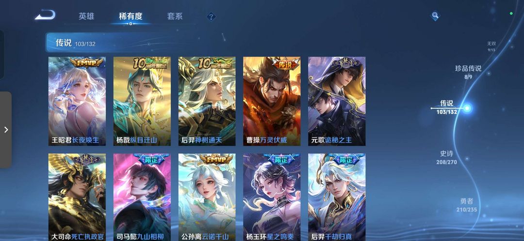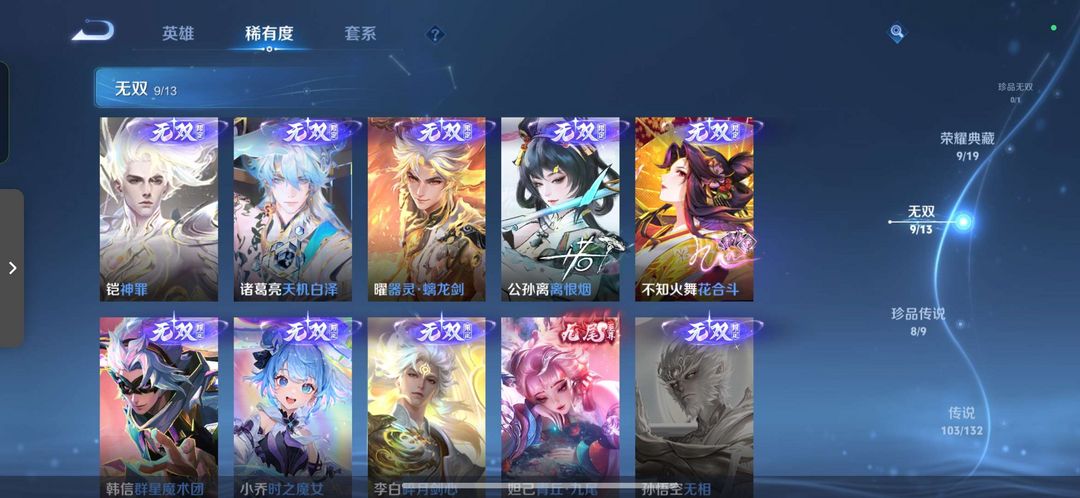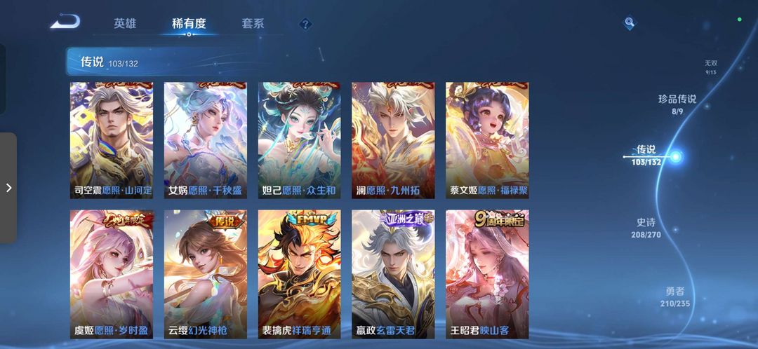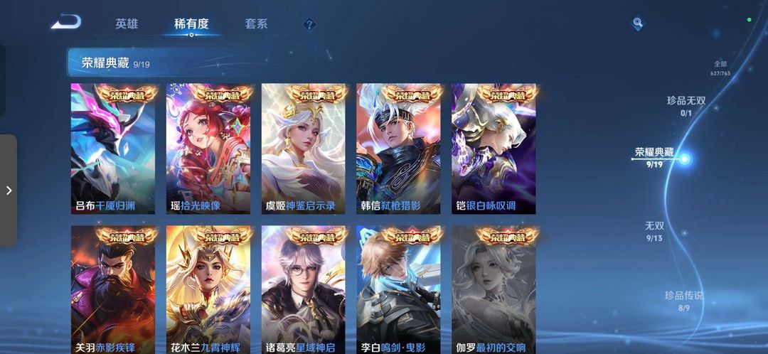 总皮肤627 荣耀典藏9 传说皮肤103 无双9 珍品传说9 铭文满级