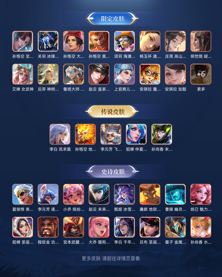 装备描述:基本全英雄,很多热门皮肤,李白凤求凰,冰封战神,美猴王,安琪拉小厨娘,千年之狐;逐梦之影,街霸,孙尚香末日机甲,圣诞狂欢,圣诞恋歌,逐浪之夏,曹操幽灵船长,天狼征服者,拳王,赵云白执事,皇家上将等