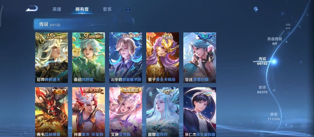 历史荣耀v10 低场次不到w场 340皮单水凯64传多热门限定 单星传蓝宫本 多皮吕布 多皮木兰 伪