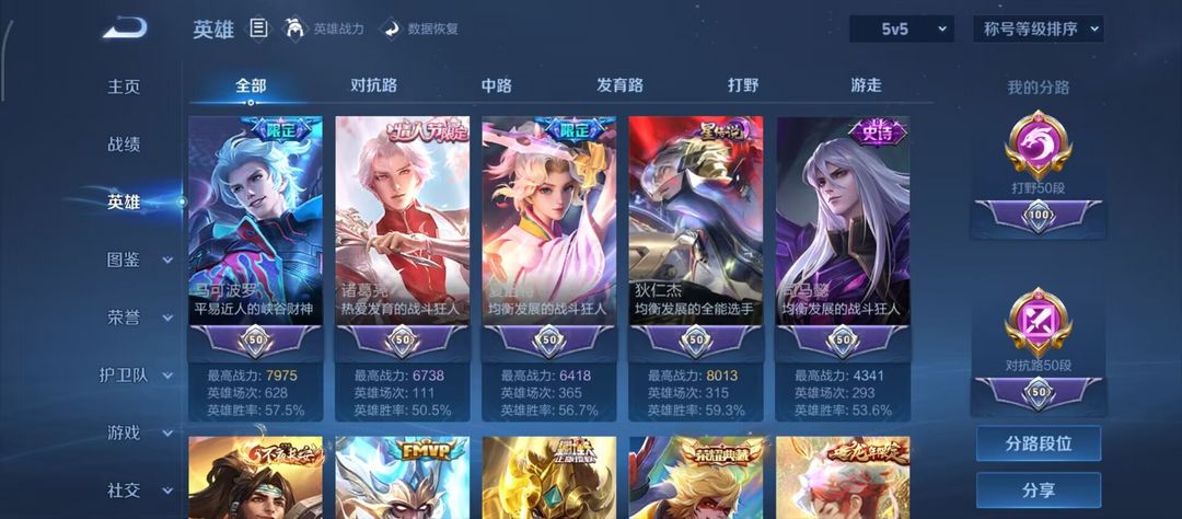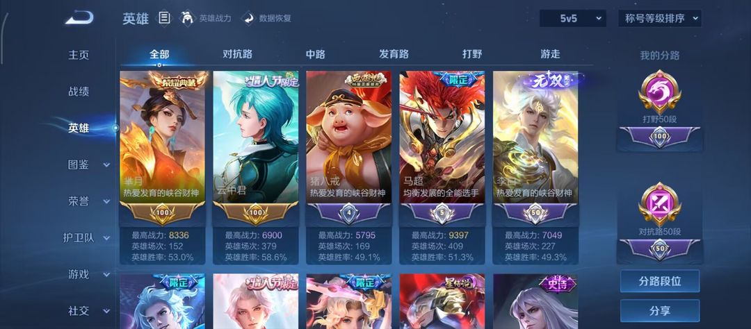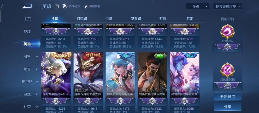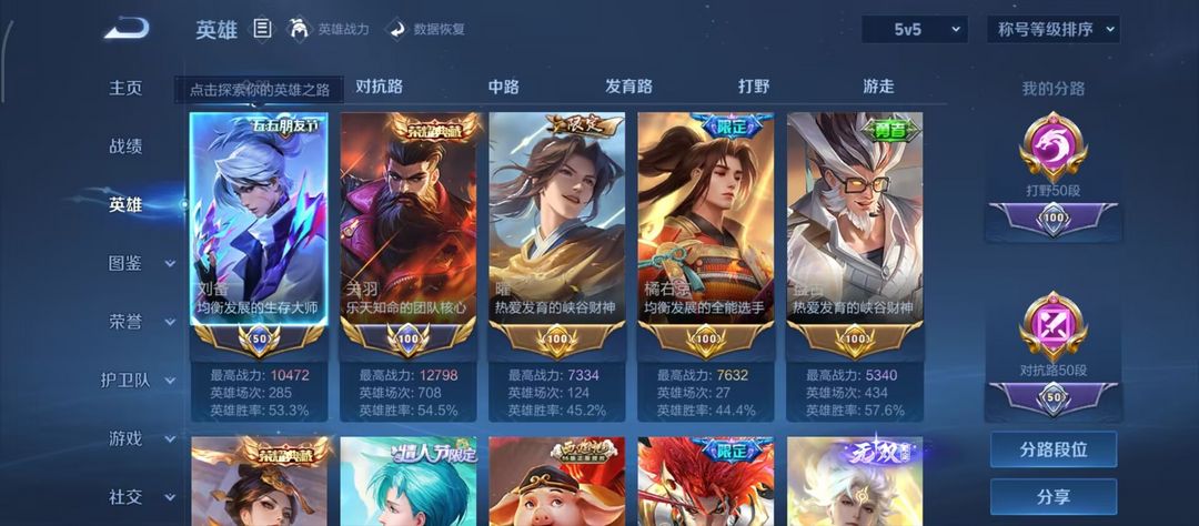 v10对抗打野位 1.27w小国关羽刘备4省标10市标 历史百星503皮5水(伽铠羽悟芈)69传3星
