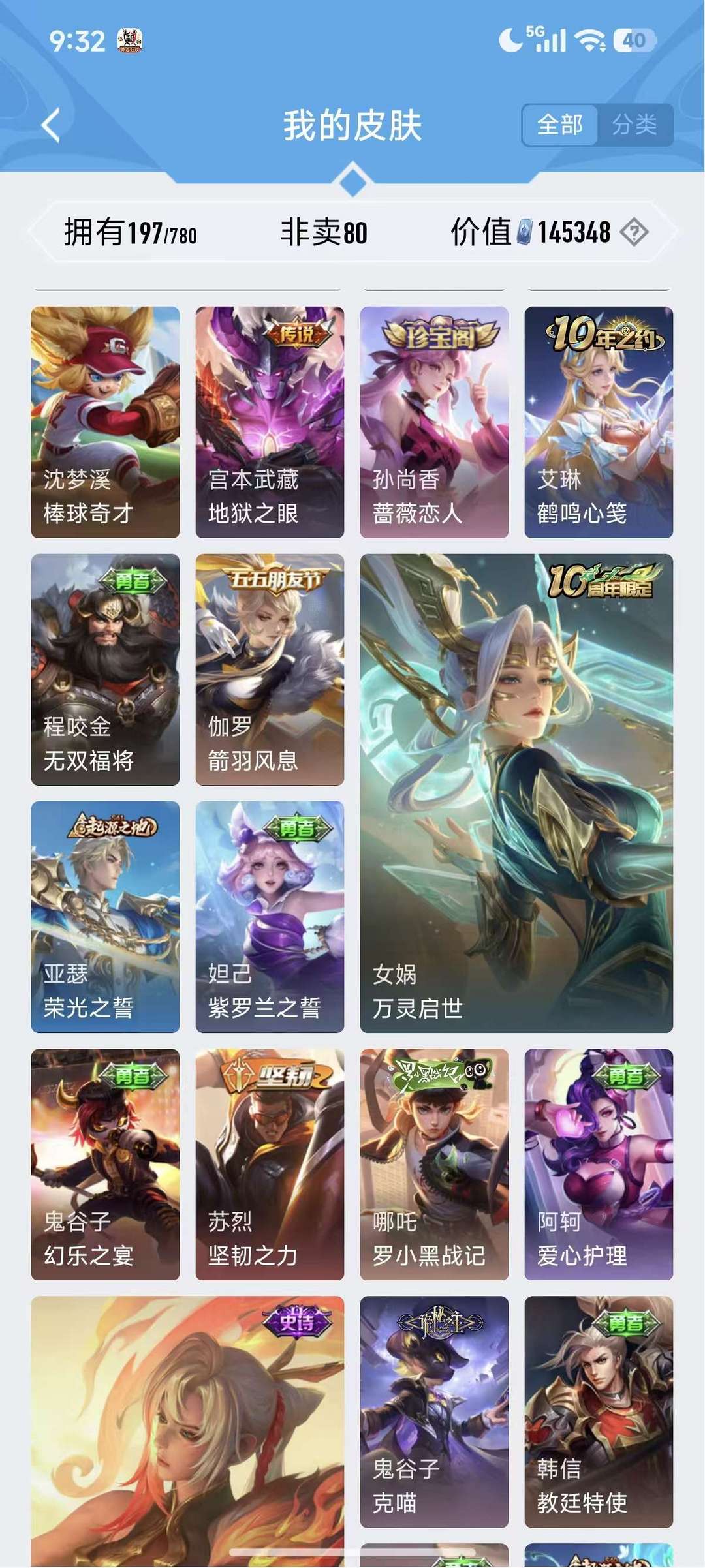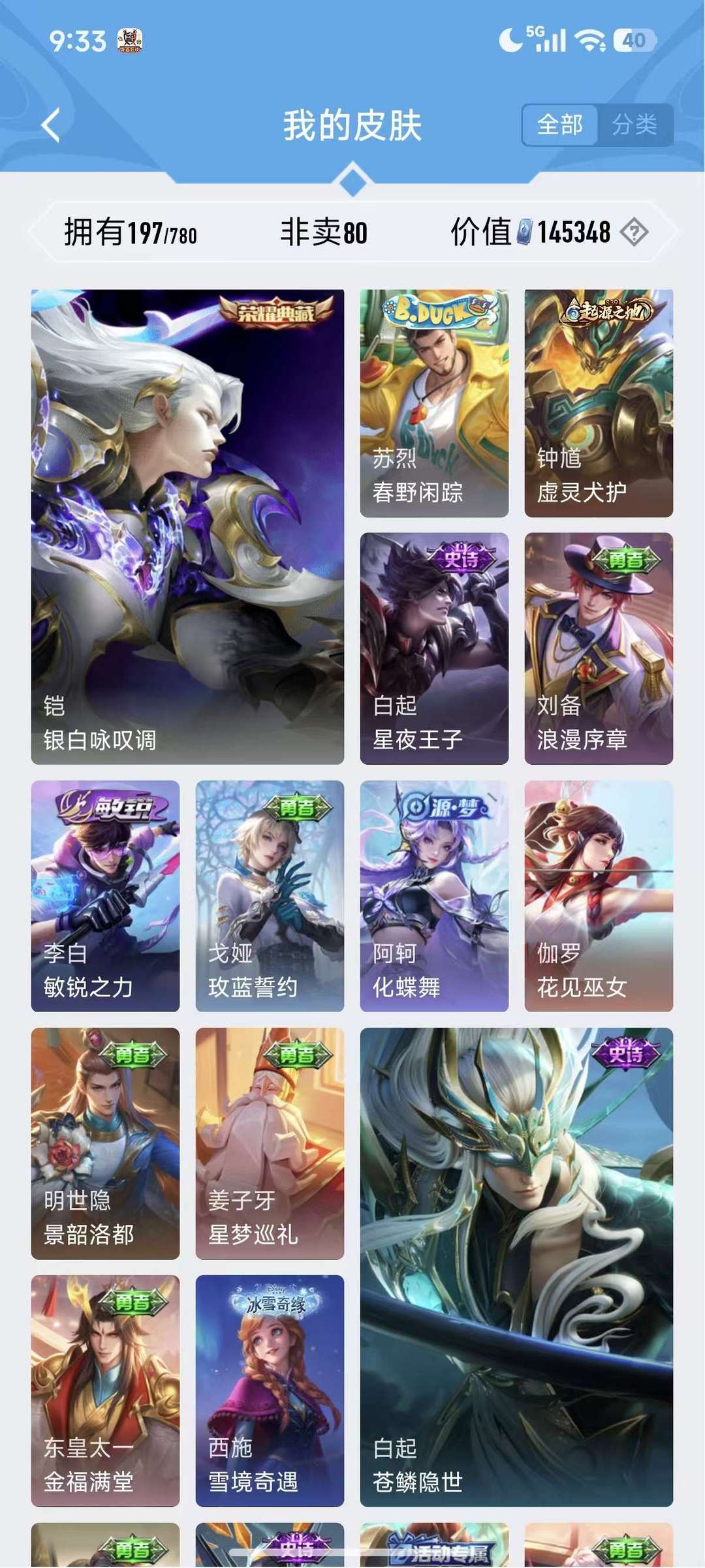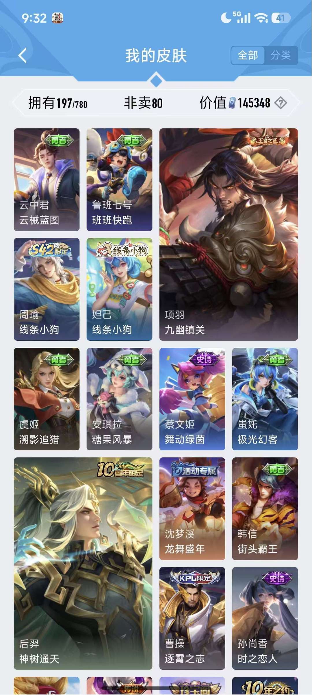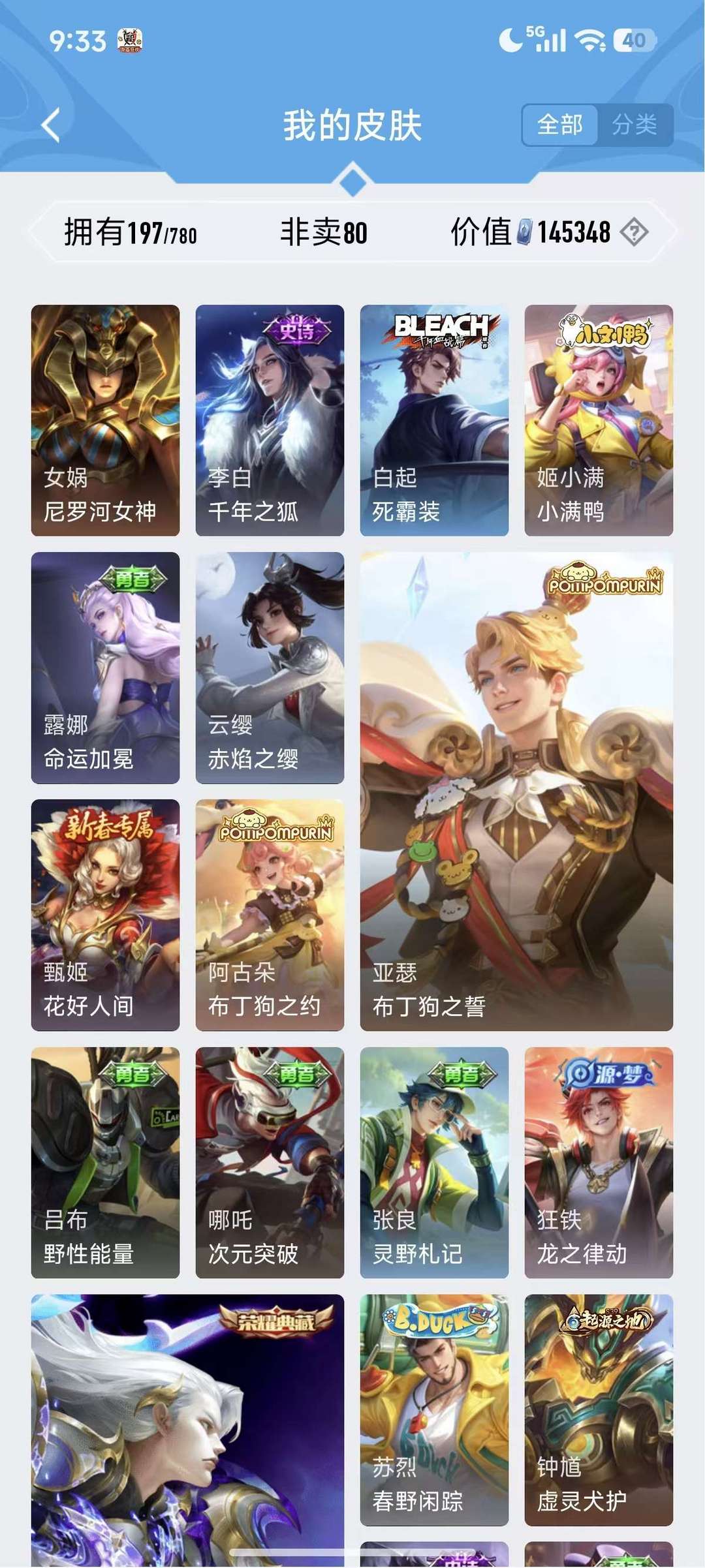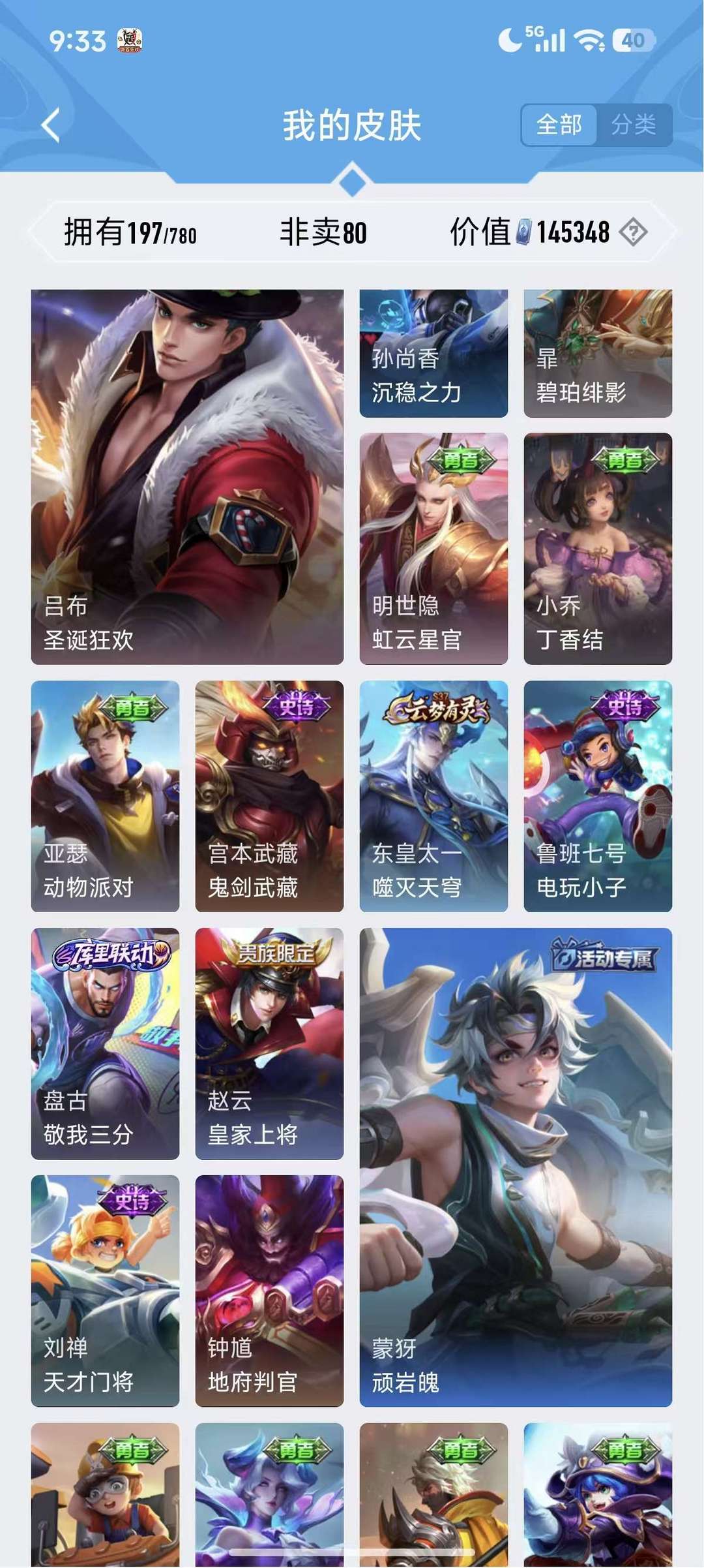 贵族V5账号,197皮含荣耀典藏,多限定,安全稳定,可排位。