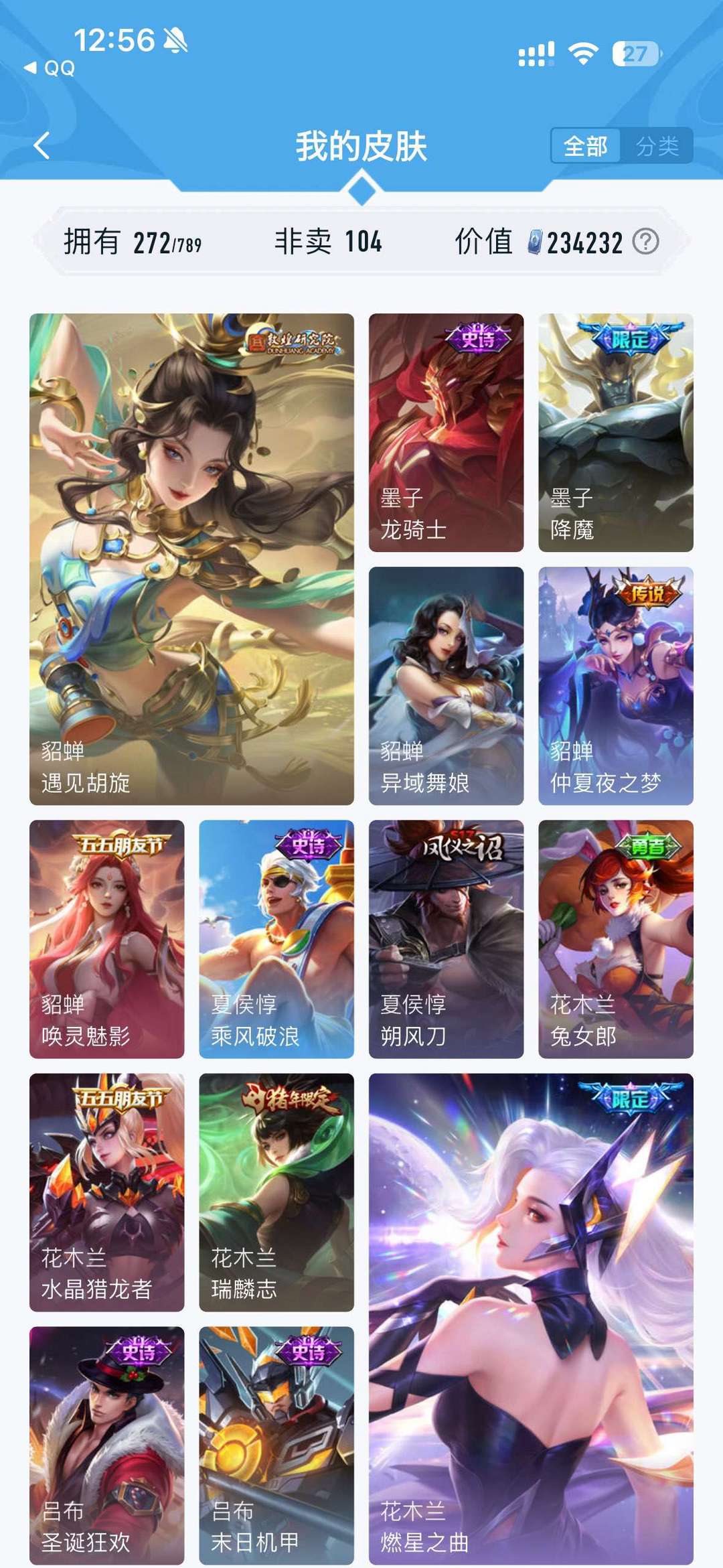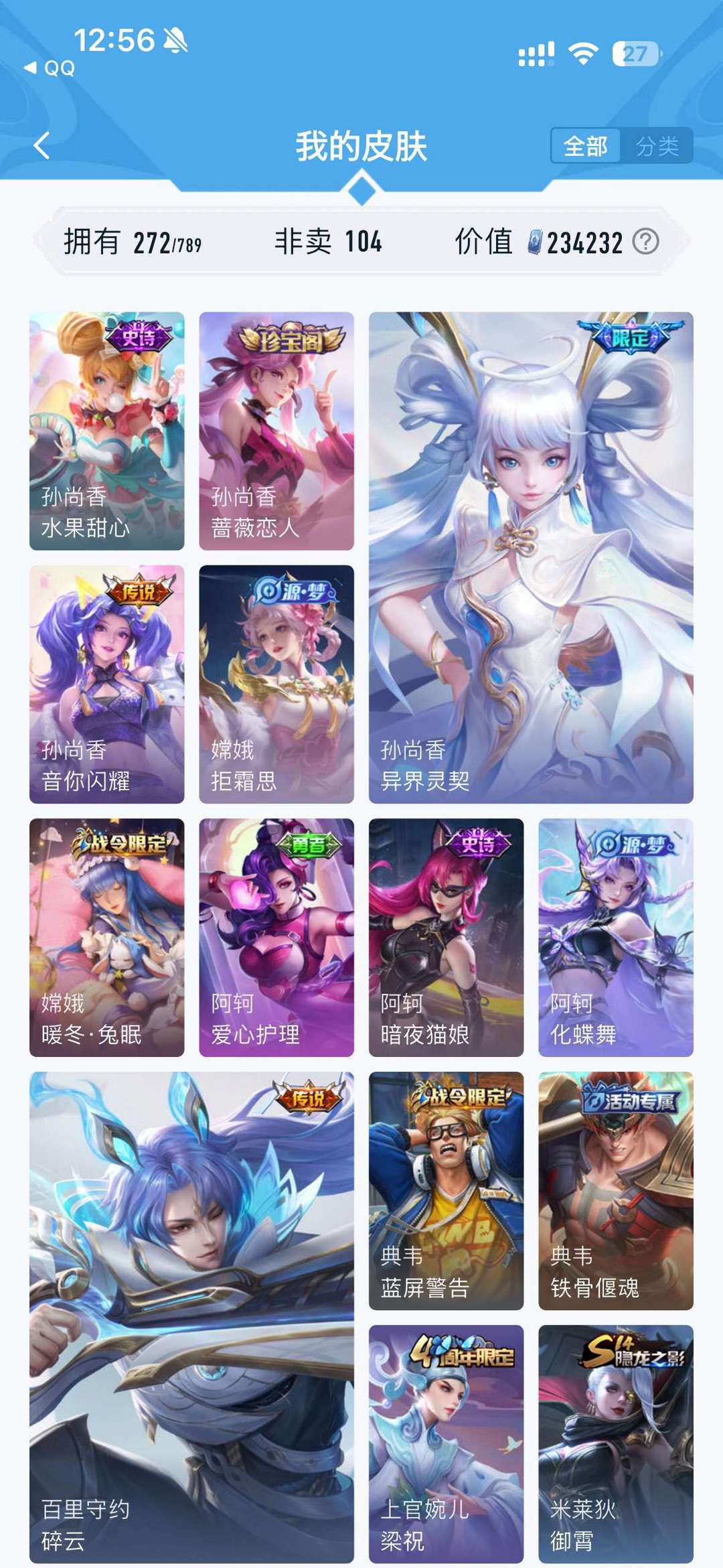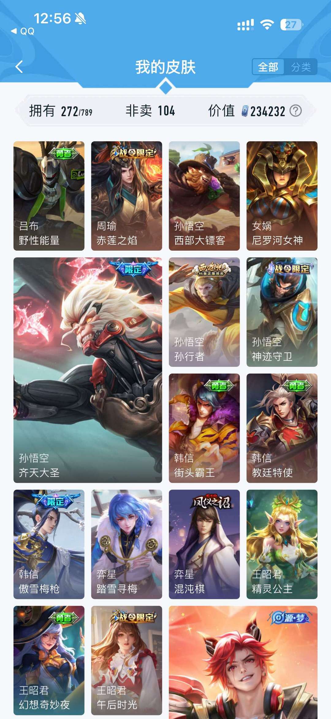 有很多限定传说皮 好久没玩了 原本贵8 一百多款限定皮肤 一共272款皮肤