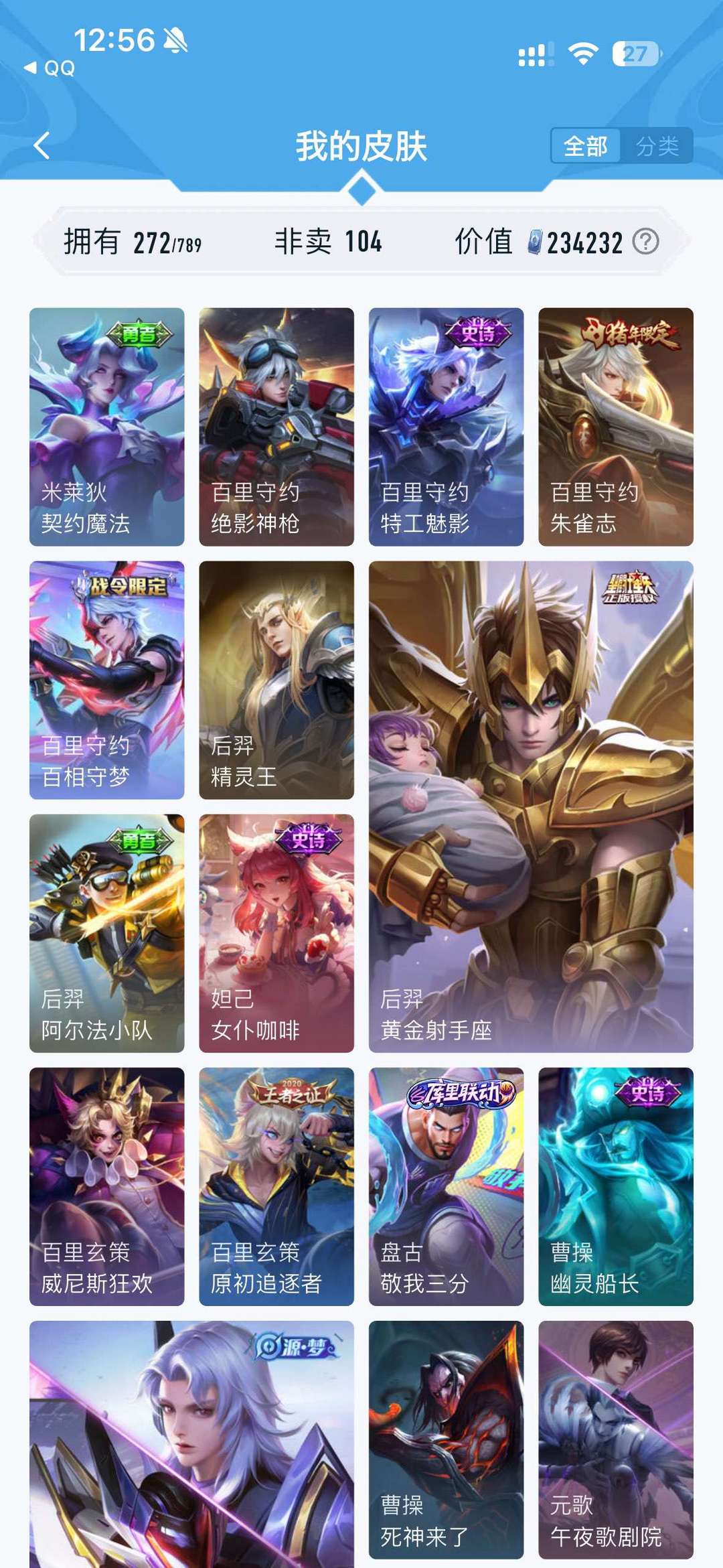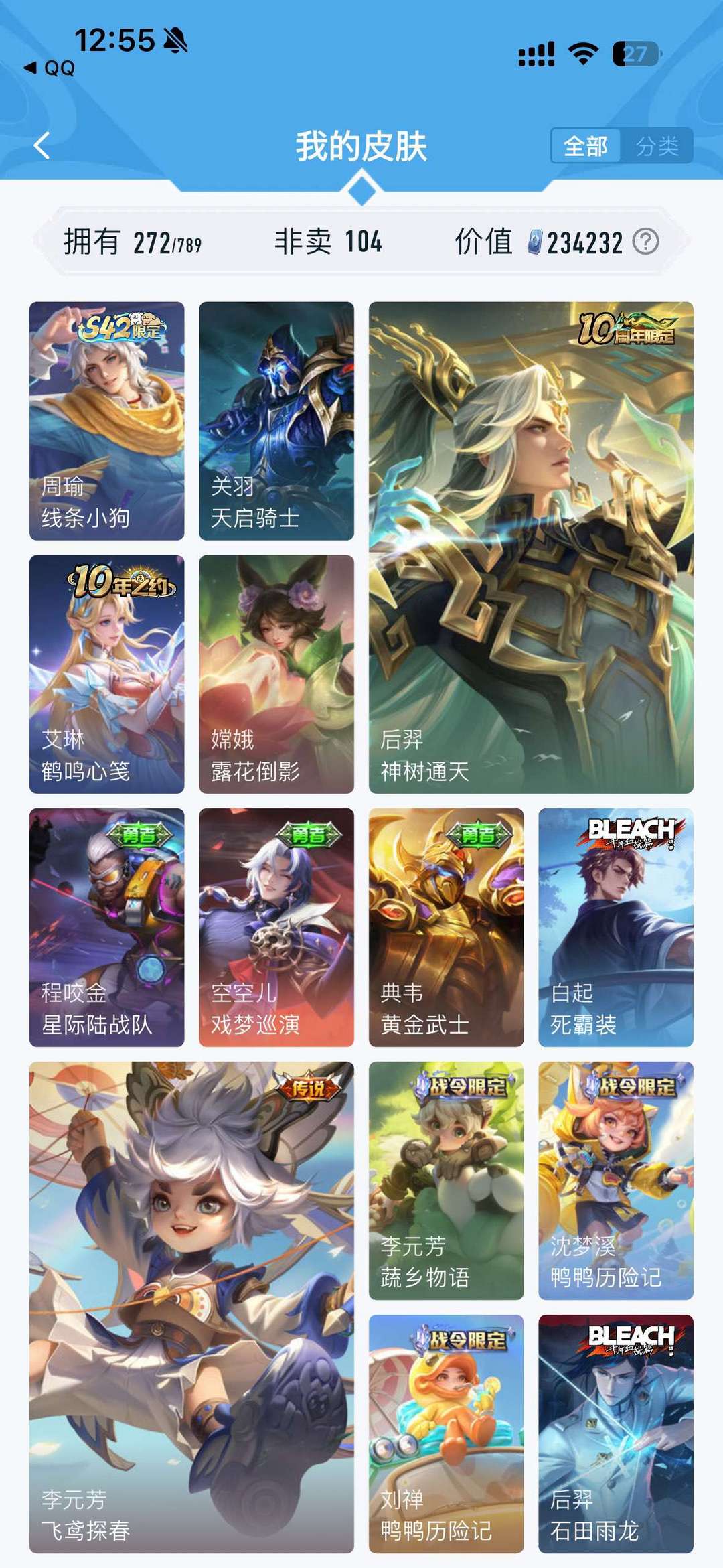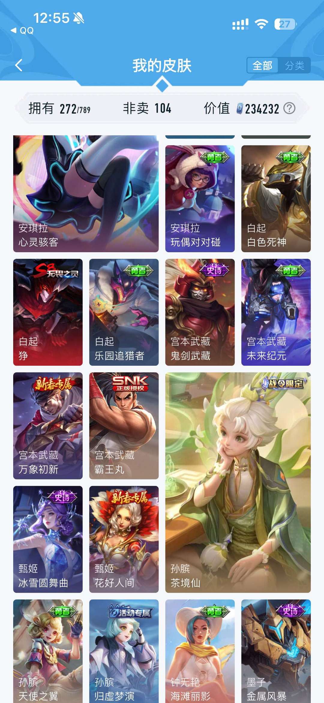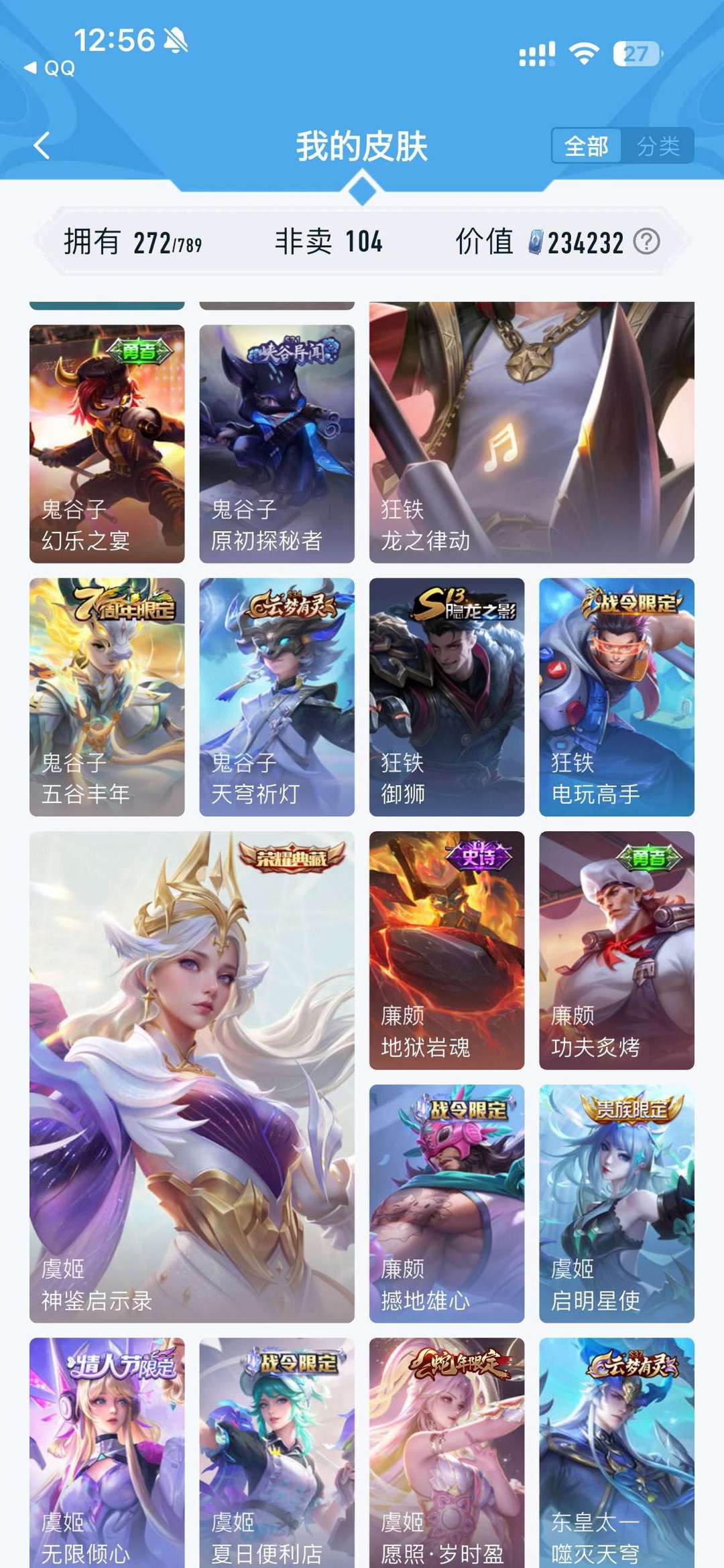 有很多限定传说皮 好久没玩了 原本贵8 一百多款限定皮肤 一共272款皮肤