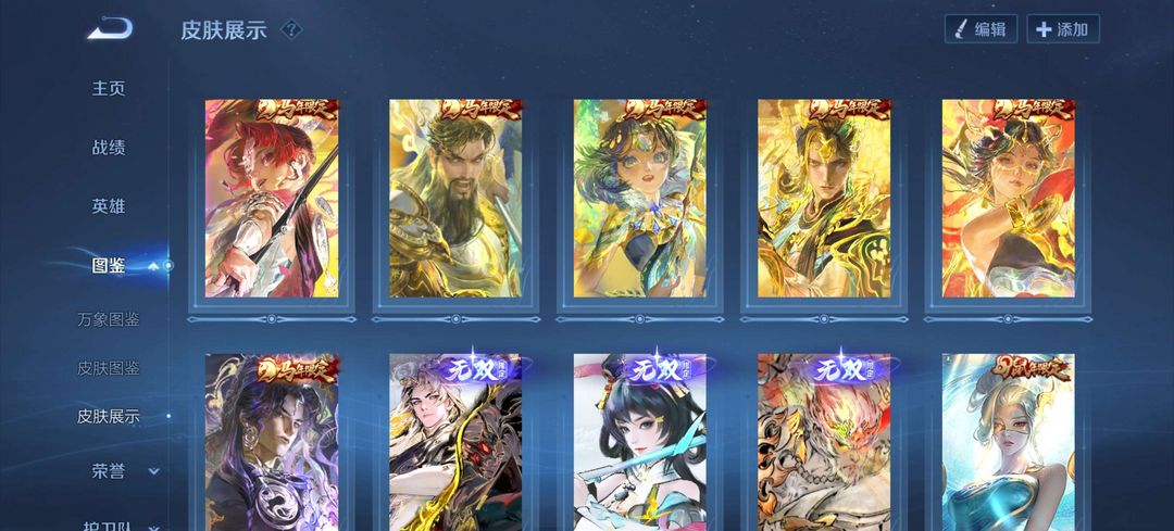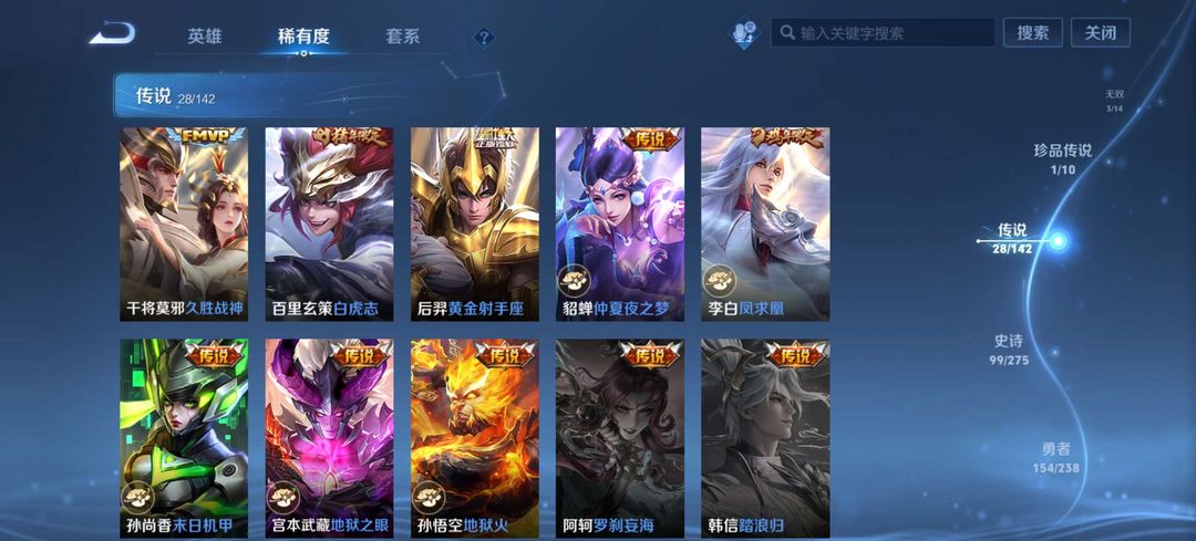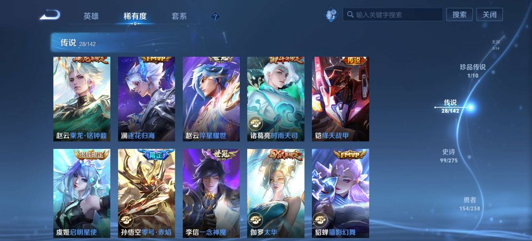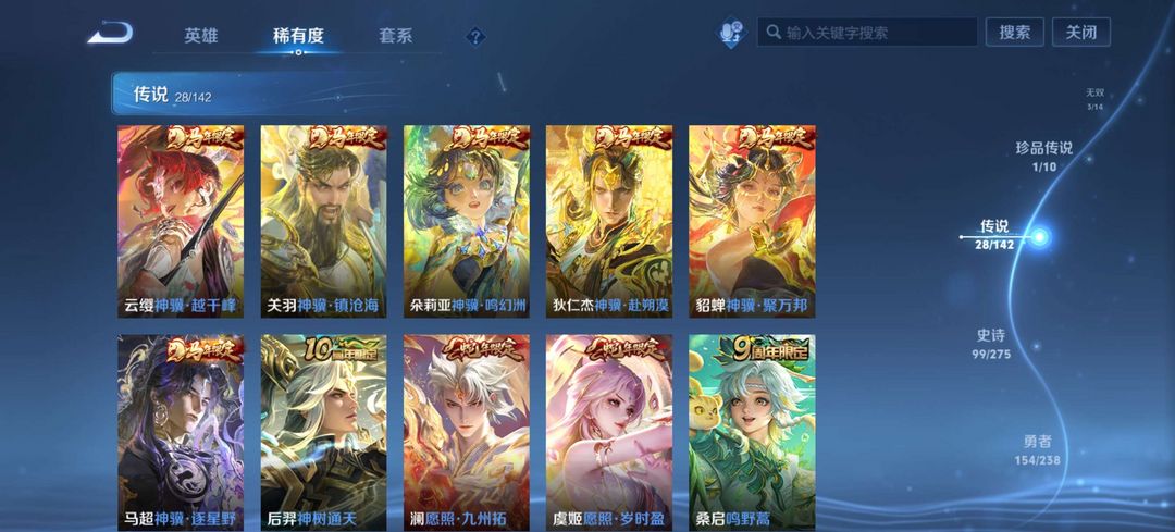账号共353款皮肤,含1典藏3无双1珍品传说,28款传说含多年限定及全套马年限定,收藏度高。