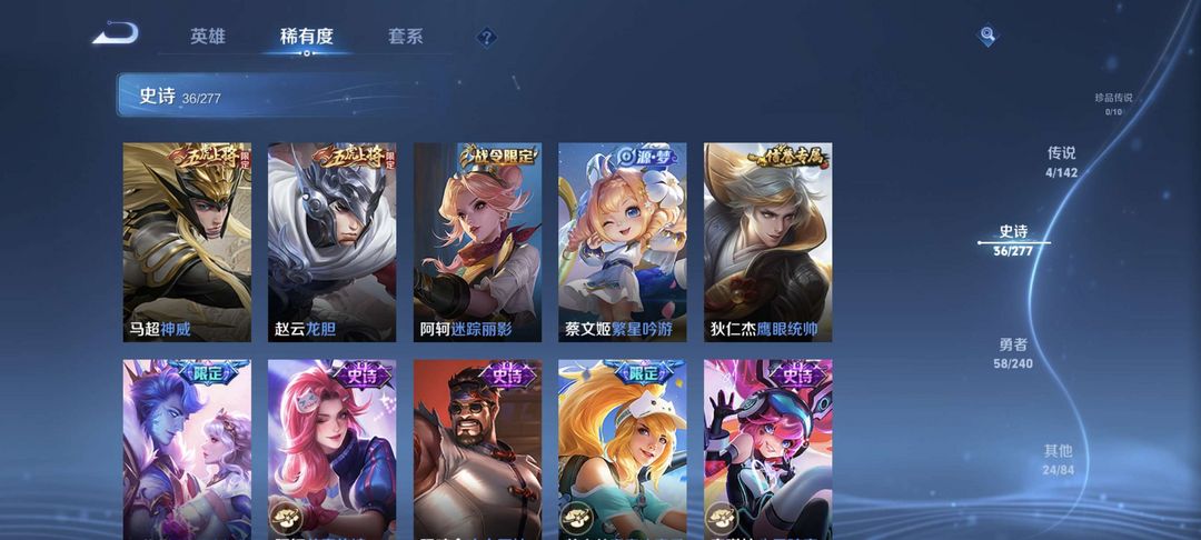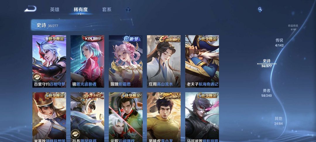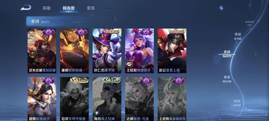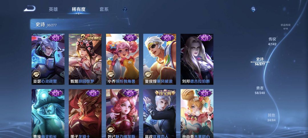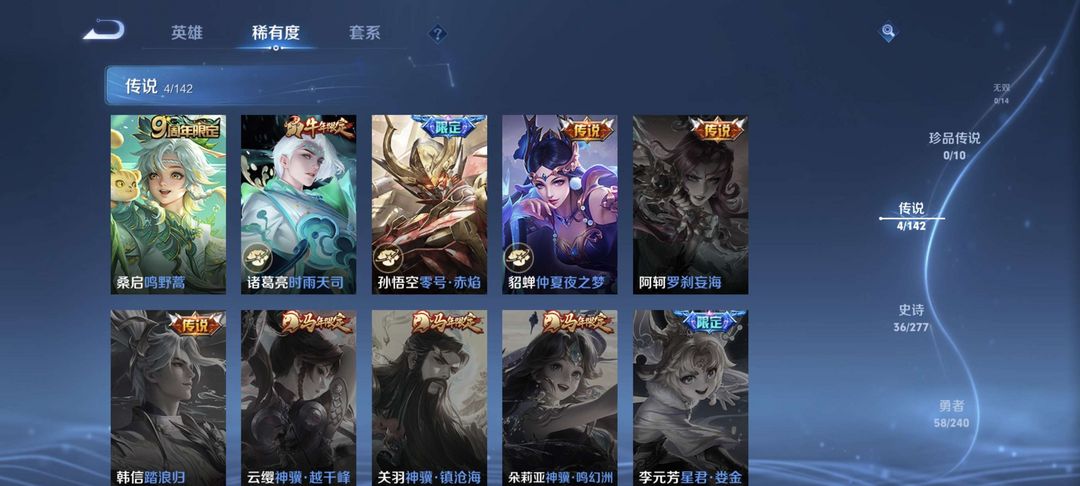 装备描述:安卓q区,122皮肤4传说,36史诗,诸葛亮时雨天司,貂蝉金色仲夏夜,孙悟空零号赤焰,史诗多限定