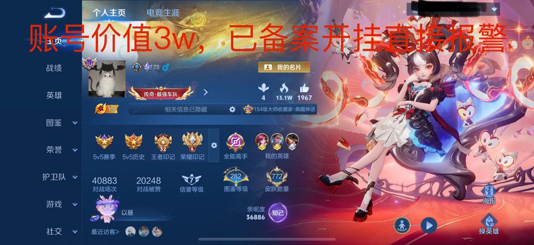 限制: 租号1次及以上 | 撤单率<40%才可租用此帐号装备描述:>>>>>>毁号,涉及毁坏虚拟财产罪及计算机安全罪,请文明游戏素质游戏,让我们共建美好租号平台>>>>>> 本游戏账号: V10荣耀贵族用户,基础段位:至尊星耀III,英雄多,皮肤多。典藏皮肤18个,感受典藏皮肤带来的优质体验快感,FMVP皮肤12个,尽情享受FMVP皮肤带来的主角光环, 私人所属英雄皮肤有:孙尚香 杀手不太冷||瑶 拾光映像||虞姬 神鉴启示录||孙悟空 全息碎影||小乔 天鹅之梦||伽罗 最初的交响||韩信 弑枪猎影||貂蝉 幻阙歌||诸葛亮 星域神启||李白 鸣剑·曳影||关羽 赤影疾锋||鲁班七号 星空梦想||武则天 倪克斯神谕||芈月 大秦宣太后||夏侯惇 无限飓风号||花木兰 九霄神辉||铠 银白咏叹调||程咬金 活力突击,等等 注意事项: A.游戏过程中请不要恶意挂机或者不文明发言;B.恶意挂机、顶号等行为将被拉黑无法再次下单;C.进入游戏后中途请勿退出登陆,否则无法再次上号;D.部分账号由于异地登录可能会出现密码错误提示,通常再尝试5-6次后可上号。 |||||||||>喜欢本账号请点 ☆收藏☆ 方便下次租用,谢谢光临惠顾|||||||||