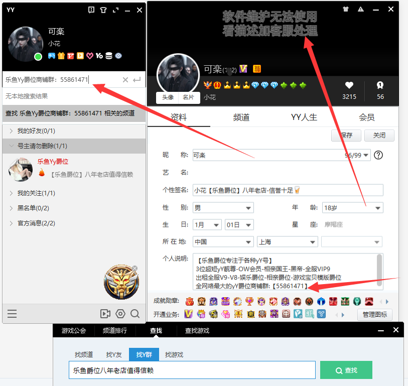 装备描述:上号请加.Q.q.群(5586.1171)手机也可正常上号✿登录不上去的老板✿找工作室客.服协助上号歪歪商务-欢迎各位来租号,最近封号狗太多 即日起 本店号码 本店股东租V9-v8-爵位-虎牙-抖音-请下单找管理员协助上号,协助手机,登录,恶意投诉者拉黑处理!玩相亲模板的老板 看图拿号,【价格是商铺会员价,普通客户租号请找商铺拿号单原价租用YY账号 】租号老板请注意--- 歪歪专用上号器下载址:sh.qybug.com 我们会给您补时15分钟,给您带来不便请谅解✿如果需要手机上请找商铺拿账号密码上号 ✿ 妹纸租号不容易 各位大哥多多支持各种撩妹号!文明租号 马甲可以随便上 其他勿动! 小女子谢过各位老板支持!撩妹神助力 装B撩妹必选!老租户一律低价畅玩 绝不涨价!如果违反了以上条款中任意一条 号主 则有权利 强制登陆 修改帐号密码