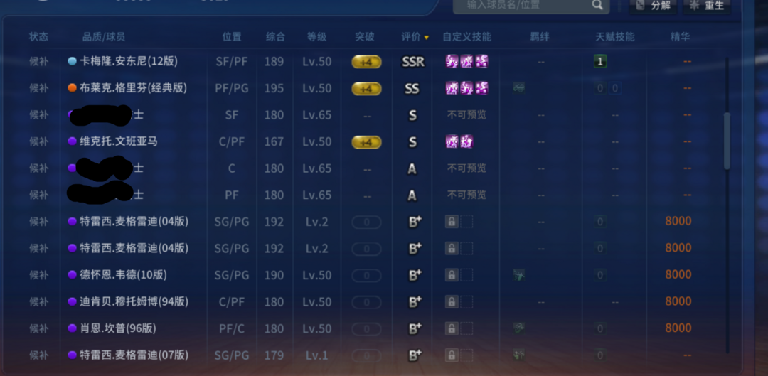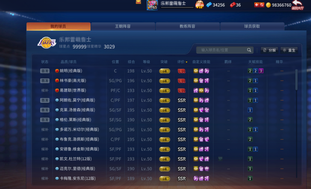装备描述:0. 注意!!!目前是超巨40星段位!!!无法组队!!! 1. 热门球员:林书豪,克莱,莱斯,姚明,易建联,莫宁,汤普森,安东尼,杜兰特,维金斯|斯台普斯(电信) 。 2.(→→→详细介绍看这里→→→)UR姚明书豪易建联组合+稀有绝版卡卡文班亚马!!!3个UR球星(姚明书豪易),9个SSR球星(莫宁莱斯米切尔大洛维金斯12阿杜里德12瓜等等如图),1个SS球星(经典格里芬),多个女性皮肤和有趣套装,其他开胃小菜自行查看图片。 3. 不要删除任何球员、动作和服饰物品!!!不要开挂!!!不要骂人!!!不要消极比赛!!! 4. 注意先改按键再游戏!!!先改按键!!!先改按键!!
