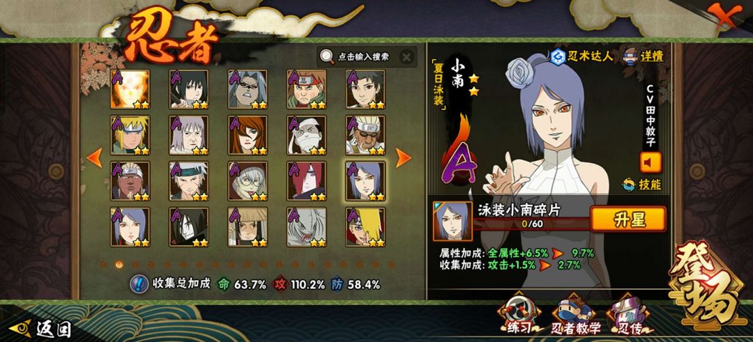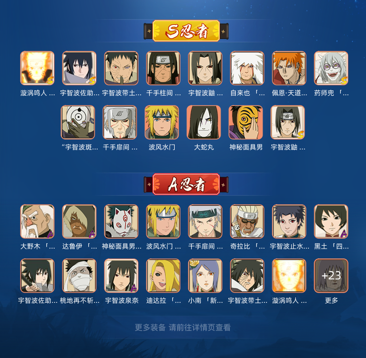 装备描述:暴怒小孩 鸡翅佐助 新春泳装小南 蛟肌 漂泊再不斩 漂泊扉间 天道超 白面具 永恒佐助 九尾鸣人 死鼬