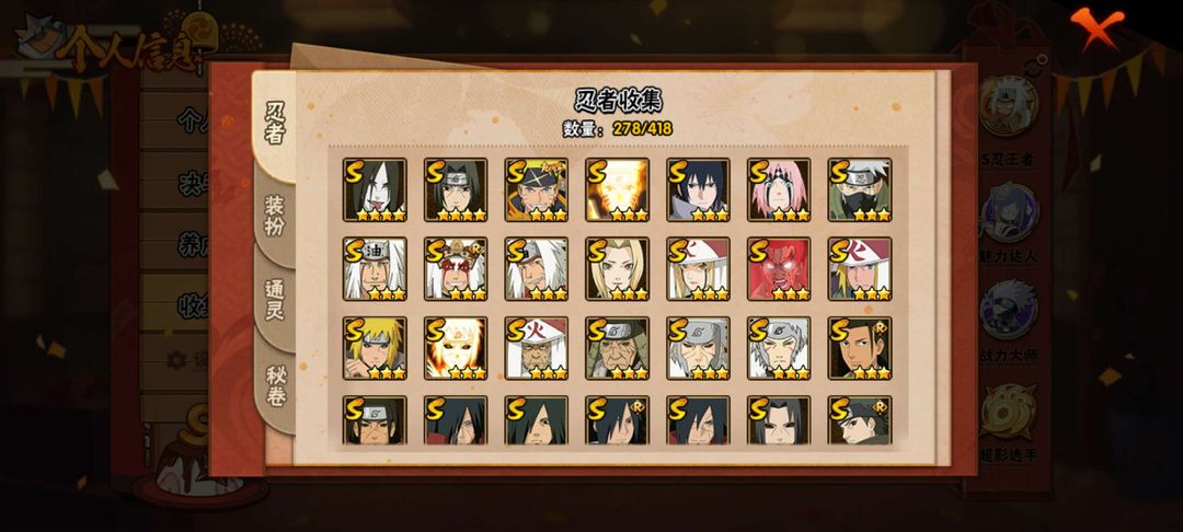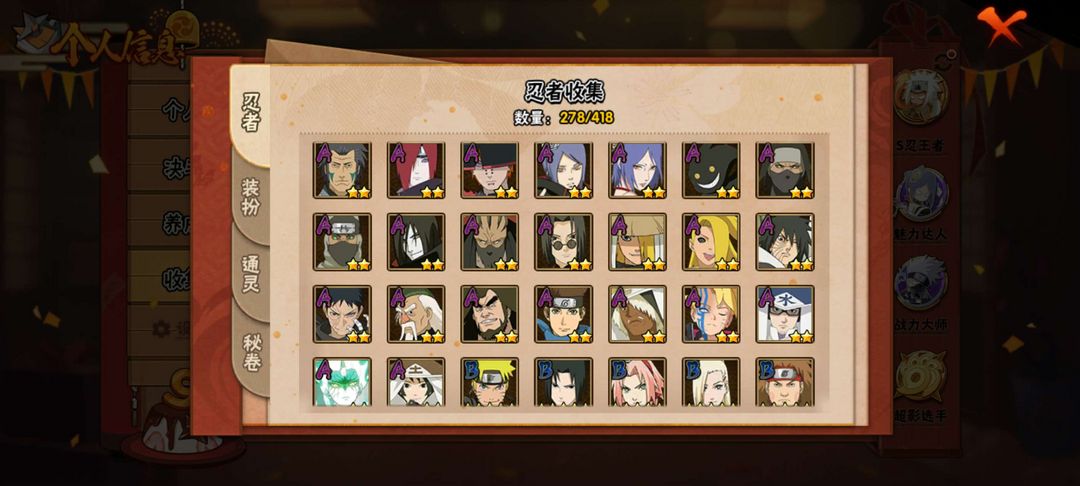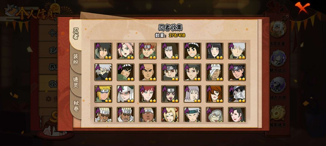 装备描述:42s65a超影段位,有很多大标,黑绝,金身水门,五影斑,全高招s高招a,漂泊带土、二代、小南、佩恩,新春我爱罗、鼬、止水,漩涡面麻,忍法帖须佐止水,创立斑,创立柱间,忍战大野木,二代水影,红叶带土,罗纱,天道超,大筒木桃矢