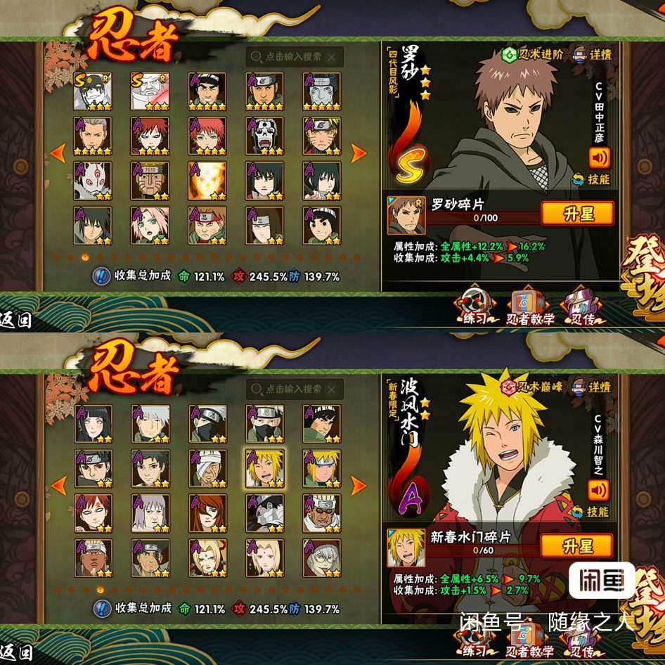 限制: 撤单率<50%才可租用此帐号装备描述:漂泊超哥,新春水门,新春止水,侠隐纲手,面麻,妖怪纲手,暴怒小孩,忍战卡卡西,罗莎和之后的忍发帖忍者。